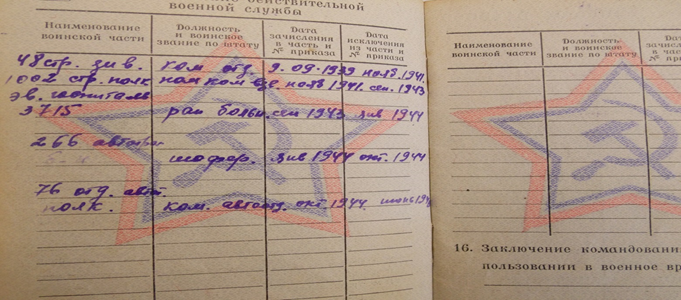 С ноября месяца 1941 года по октябрь 1943 года являлся помощником командира взвода 1002 стрелкового полка.