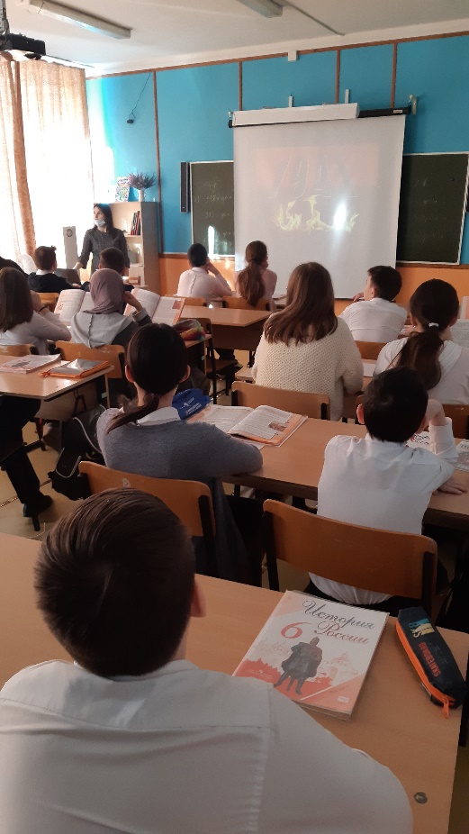 pВ рамках акции «У войны не женское лицо», 28 апреля состоялся урок мужества, который провела учитель истории Аюпова Ч.Р., посвященный подвигу юных героев комсомольцев: Зои Космодемьянской. Урок проведен в 6 классе, для членов юнармии. Ребята узнали, о героизме и твердом характере девушки, которой только исполнилось 18 лет. Зоя, юная разведчица, отдала свою жизнь за независимость и освобождение своей Родины. Страницы ее биографии, поражали своей ребят стойкостью духа и вера в победу и справедливости./p p /p pАвтор: Масагутова З.Р. ЗДВР МБОУ СОШ№3/p