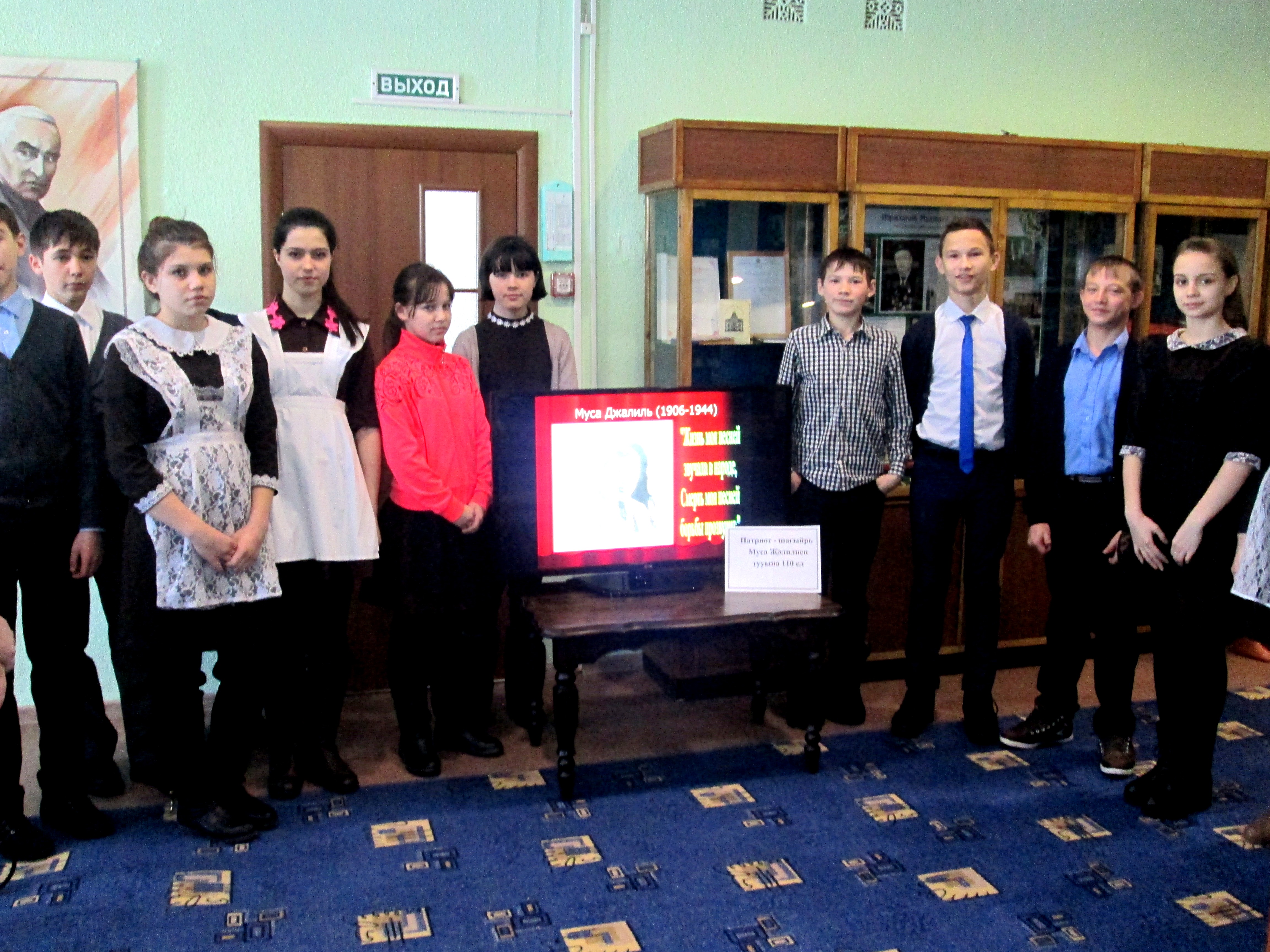 p class="rtejustify"15 февраля исполнилось 110 лет со дня рождения Поэта, Героя Советского Союза, лауреата Ленинской премии, сына Татарского народа Мусы Джалиля. Зачастую, перечисляя заслуги и регалии человека, мы перестаём вдумываться в их смысл, видеть за ними самого человека./p p class="rtejustify"Муса Джалиль погиб в возрасте 38 лет. Погиб в расцвете сил на взлёте своей творческой карьеры. Погиб героически, но о его подвиге страна узнала значительно позже его казни... Мы с детства чтим и помним имя великого татарского поэта - героя, читаем его стихи, изучаем его биографию./p p class="rtejustify"         В преддверии юбилейной даты и в день рождения М. Джалиля в музеях Альметьевского района были проведены мероприятия и для воспитанников детских садов, и для школьников, и для студентов и для взрослой аудитории. Мероприятия были самые разные: лекции, музейные уроки, беседы за круглым столом, просмотр кинофильма с последующим обсуждением. Посетителям раздавались письма, которые М.Джалиль писал с фронта своей семье, странички Маобитской тетради. Мы сделали всё, чтобы эти мероприятия не прошли формально, чтобы посетители ушли, задумавшись: «А как бы я поступил на его месте?», ведь очень важно, чтобы за чередой проводимых мероприятий не утратилась острота восприятия подвига./p