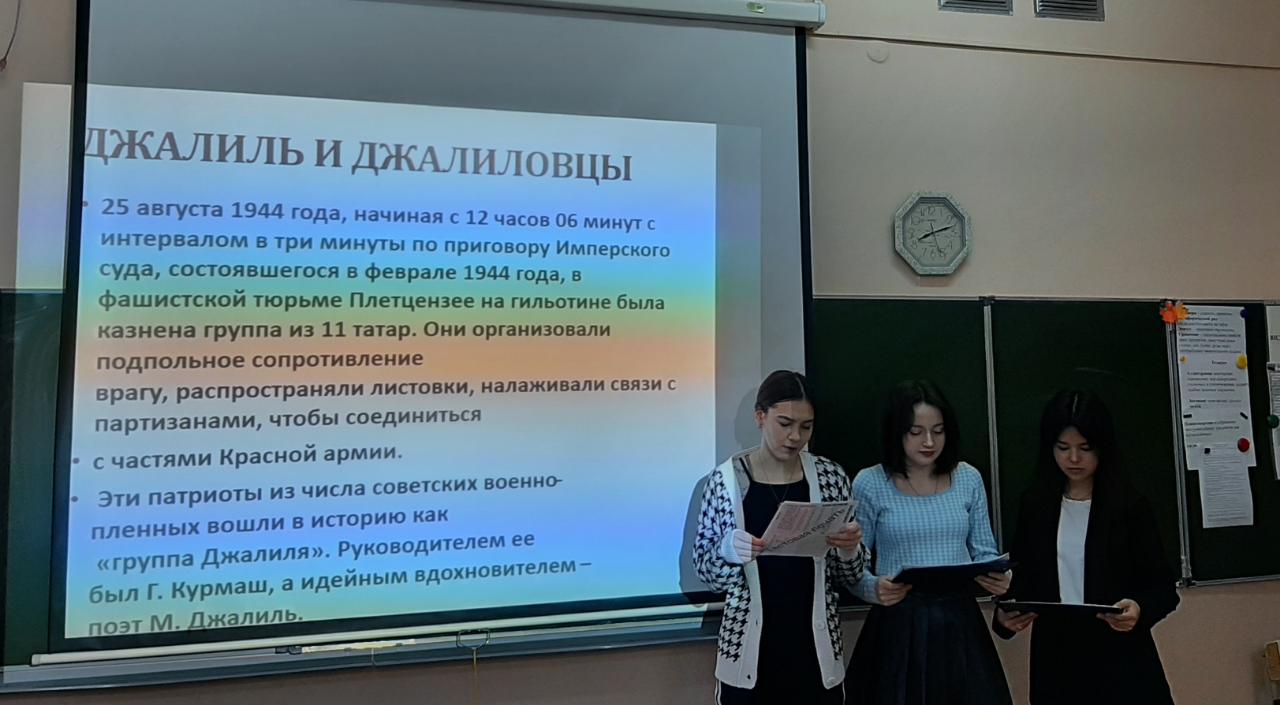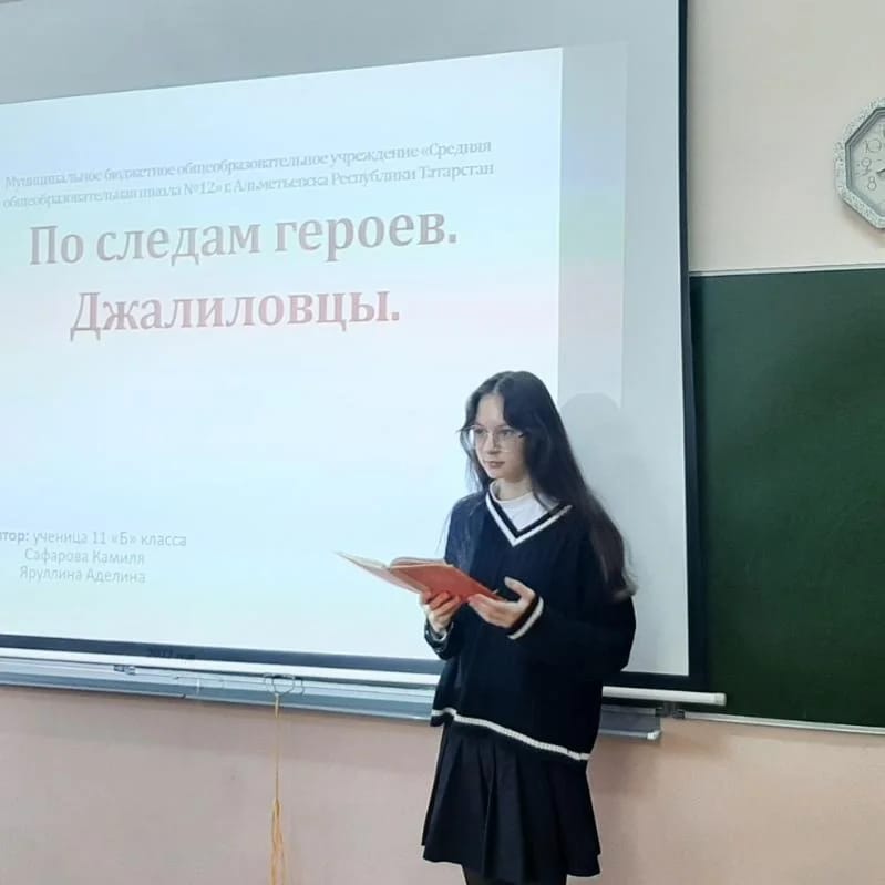 p20 апреля 2022 года в МБОУ «СОШ №12» прошёл творческий урок «Джалиловцы - герои Великой Отечественной войны», посвящённый 77-летию Великой Отечественной войны./p pВ мероприятии приняли участие ученики 8,11 классов и учителя родного языка и литературы./p pУрок начался с трансляции презентации о героях-поэтах Великой Отечественной войны и творчестве Мусы Джалиля - поэта-героя, и в честь которого названа улица нашей школы. После презентации и доклада учеников 11 класса, выступили и прочитали стихи ученики 8 класса и учителя школы. В завершении была объявлена минута молчания в честь всех героев Великой Отечественной войны./p p /p p /p p /p pМустафина Венера Рафисовна/p pУчитель родного языка/p pМБОУ «СОШ №12»/p