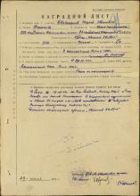"В боях с 12.07.1943 года за деревню Ягодная, высоту 246,6м и деревню Лунево его расчет уничтожил 2 станковых пулемета и свыше 50 солдат и офицеров противника и отразил сильную контратаку гитлеровцев. Достоин награжденя Орденом "Красной Звезды"