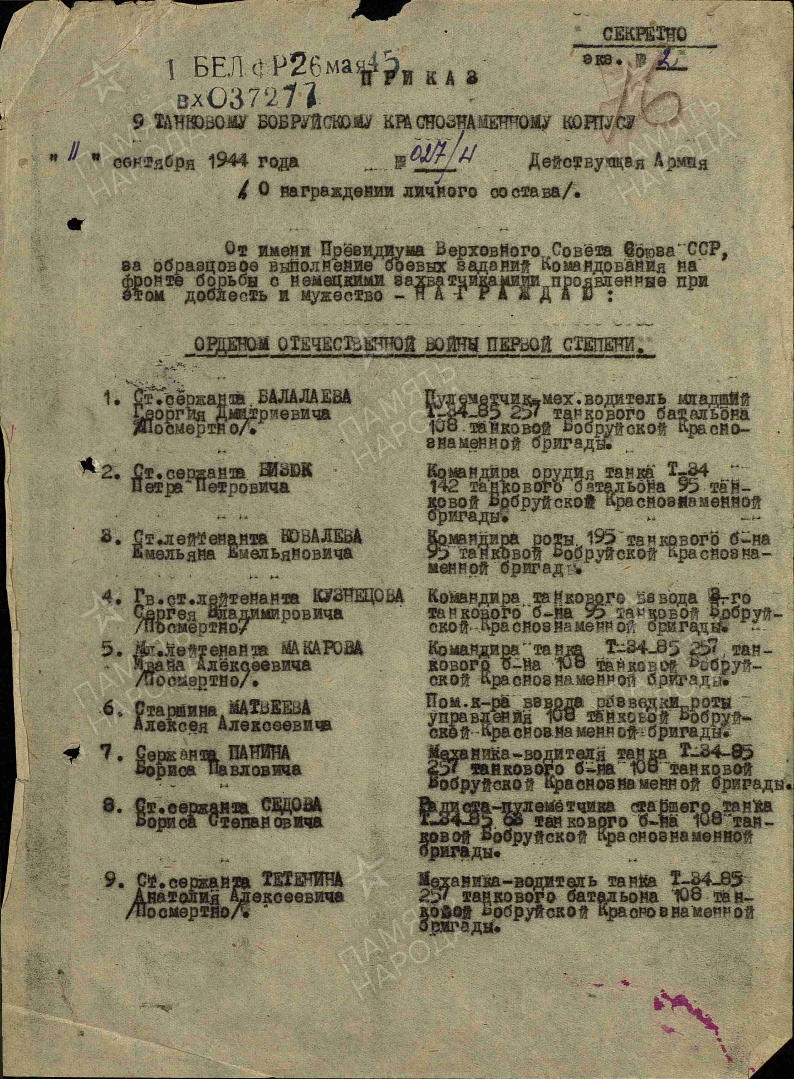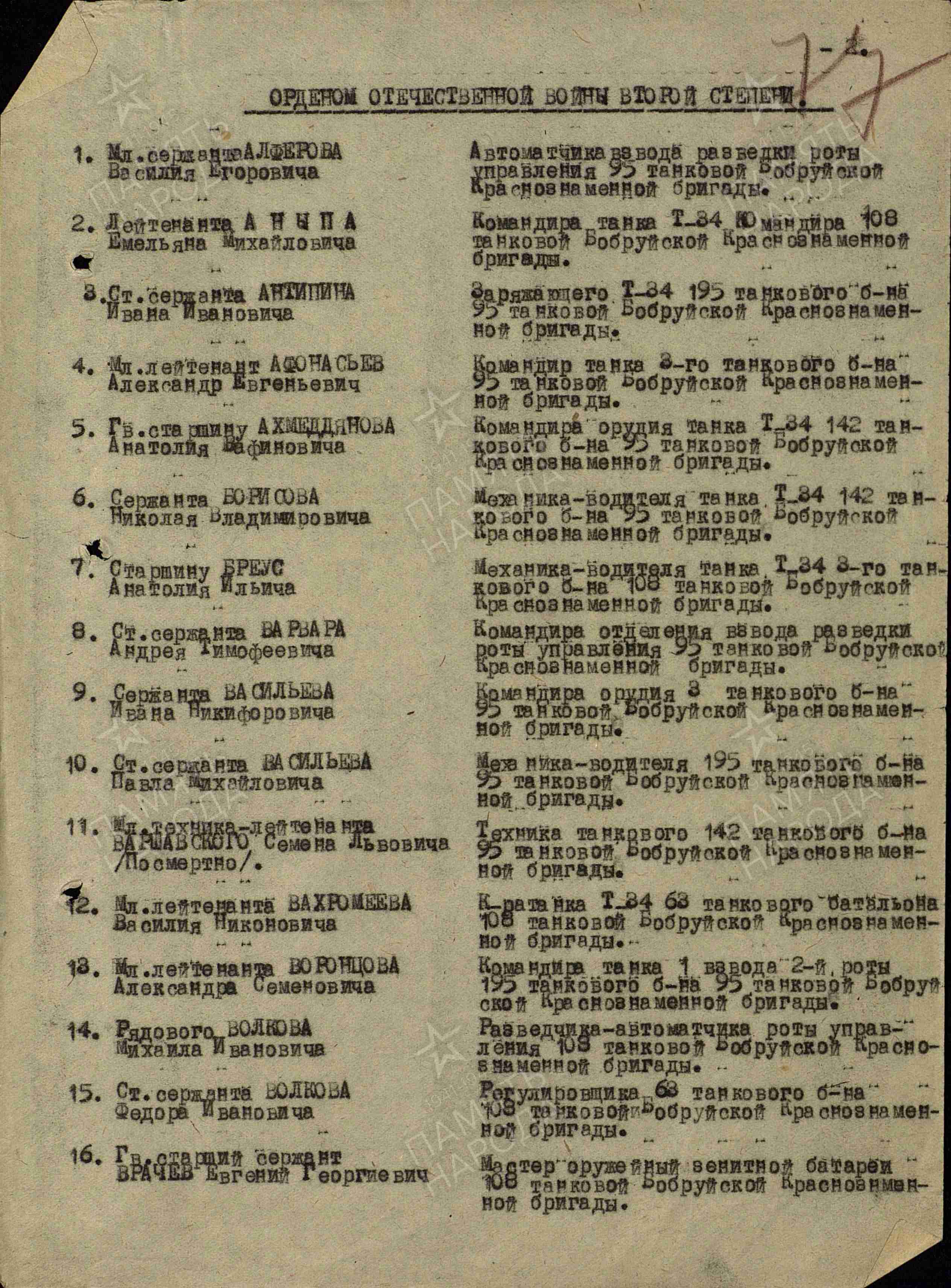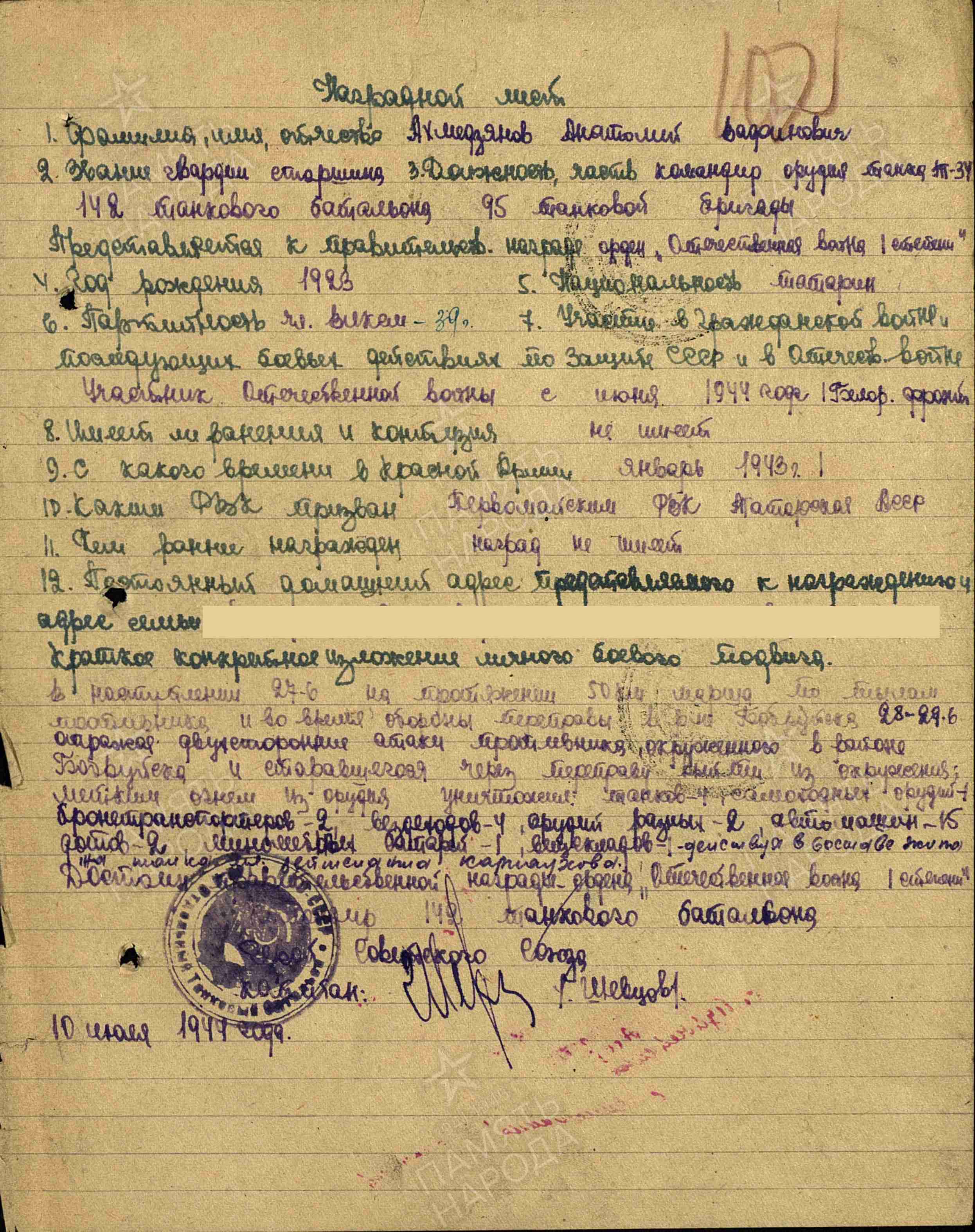 pАхметзянов Габдулхак Вафинович (1924-1972) был участником Великой Отечественной войны./p pРодился в 1923 году в деревне Туйметкино, Черемшанского района. В 1942 году закончил Казанское танковое училище (ускоренные курсы), и в звании младшего лейтенанта (командира танка) был направлен на фронт 23 марта 1942 года./p pСо слов племянника бойца Бедердинова Х.Х., боевое крещение экипажа началось под Сталинградом. Танковый корпус воевал в боевой военной операции по окружению фашисткой армии фельдмаршала Паулюса. Армия Паулюса сдалась. Советский народ и страны антигитлеровской коалиции праздновали победу в Сталинградской битве. Тогда было убито и пленено миллион фашистов. За героизм и храбрость Гвардейской танковой дивизии было присвоено название «Кантемировская». Дивизия принимала участие и в Курской битве. Танк был подбит. Экипаж погиб, а Габдулхак Вафинович чудом выжил. Был тяжело ранен и обожжен./p pПосле лечения в госпитале он вернулся в строй. В составе 1-го Украинского фронта, под руководством Маршала Победы дважды Героя Советского Союза Ивана Семеновича Конева участвовал в освобождении Киева (осень 1943 года, «Корсунь-Шевченковская операция»)./p pДалее в 1944 году с боями танковая дивизия освобождала Польшу. Принимал участие Габдулхак Ахметзянов и в «Берлинской операции», а потом по приказу Иосифа Сталина их танковая дивизия оперативным марш-броском освобождала город Прага («Пражское восстание»)./p pДень Победы 9 Мая Габдулхак Вафинович встретил в освобожденной Праге. Так со вторым экипажем он дошел до Победы. Это уникальный случай, т.к. жизнь экипажа в бою длится минуты, а они воевали одним составом три года и все остались живы./p pПосле окончания войны, Габдулхак Вафинович продолжил военную службу в Гвардейской «Кантемировской» танковой дивизии, которая базировалась в Подмосковном городе Алабино./p pВ 1952 году, их дивизия принимала участие в военных операциях в городе Ровно, Украинской ССР./p pВ 1953 году после смерти Иосифа Сталина и по приказу Георгия Жукова, их дивизия была в оцеплении Москвы, т. к. была угроза захвата власти НКВД под руководством Лаврентия Берии. Мятеж НКВД был сорван./p pПо данным архива, 10 октября 1955 года Ахметзянов Габдулхак Вафинович был демобилизован и продолжил дальнейшую трудовую деятельность в структуре компании «Татнефть» города Альметьевска./p pБыл женат, но рано остался вдовцом. Воспитывал сына и дочь. Умер в 1972 году. Сказались боевые раны и слабое здоровье. Был торжественно захоронен в Альметьевске на Татарском кладбище. На его похороны приехало много земляков из родной деревни Туйметкино./p pДолгие годы близкие не могли найти информацию о боевом пути Габдулхака Вафиновича в архивах. Совсем недавно удалось найти документы подтверждающие подвиг героя. В архивах его имя значится как Ахмеддянов Анатолий Вафинович, Ахмедзянов Анатолий Бафинович и тд./p pПо информации из наградного листа от 10 июля 1944 года Орден Отечественной войны I степени Габдулхак Вафинович получил за подвиг:/p pВ наступлении 27 июня и во время обороны переправы в районе Бобруйска 28-29 июня, отражая двухсторонние атаки противника, окруженного в районе Бобруйска, и старавшегося через переправу выйти из окружения. Метким огнем из орудия Габдулхак Вафинович уничтожил 4 танка, 1 самоходное орудие, 2 бронетранспортера, 4 вездехода, 15 автомашин, 2 дота, 1 вещевой
