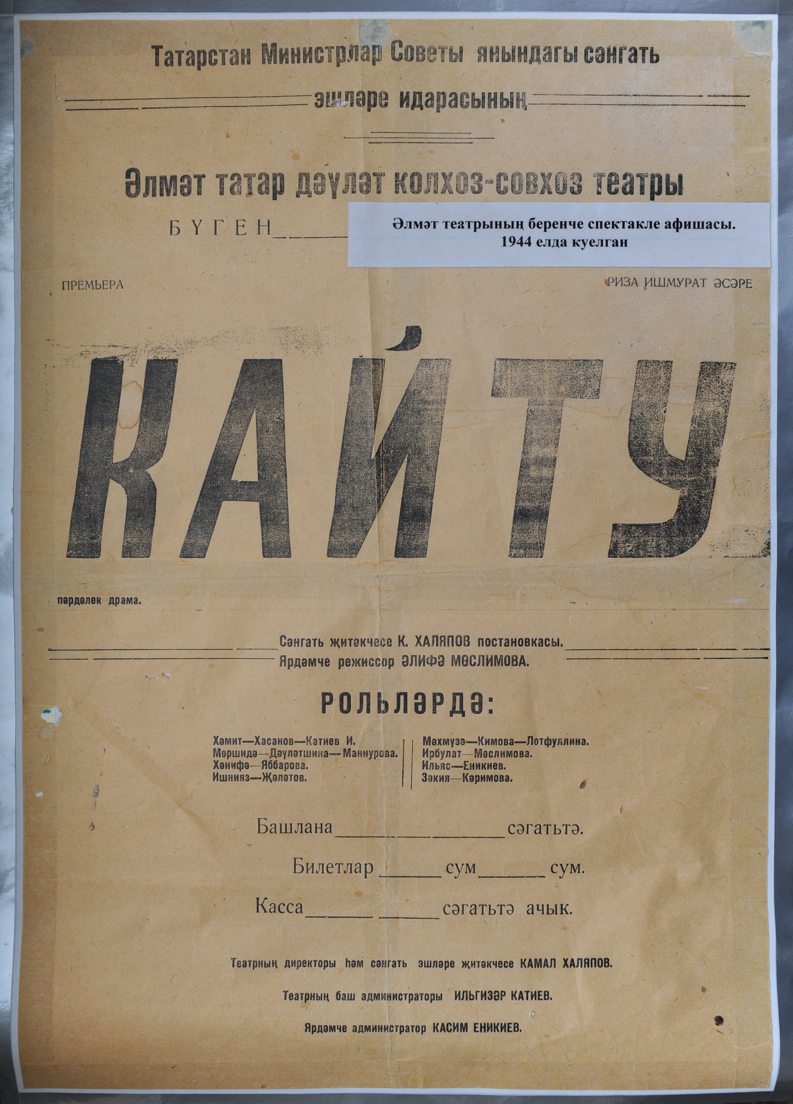 Состоялся он в конце мая 1944 года. Это была драма Ризы Ишмуратова «Кайту» («Возвращение»). Главную роль – раненого красноармейца Хамита – исполнял А. Галиев. Другая главная роль – председателя колхоза Муршиды – была исполнена художественным руководителем РДК Н. Давлетшиной.