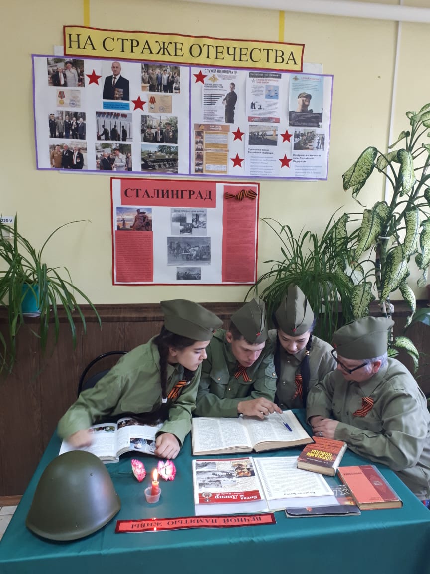 pВ ходе мероприятия участники знакомились с историей Сталинградской битвы: с историей дома Павлова, так его стали называть по фамилии сержанта Павлова, оборонявшего дом, с историей главной высоты - Мамаева кургана, удержать которую было делом чести солдат. Читали о судьбах и подвигах отважных бойцов, которые бились за каждый дом, за каждую улицу, затем все вместе озвучили девиз Сталинградской битвы: «Ни шагу назад!». Участники также имели возможность полистать страницы книги «Память», где на 594 страницах имена без вести пропавших, умерших от ран героев Великой Отечественной войны./p pНе слишком ли дорогая цена мирной жизни? Давайте беречь мир и гордиться нашими дедами и прадедами - поколением освободителей! В знак вечной памяти и благодарности за мир, участники зажгли свечу памяти и оформили тематический стенд «Сталинград». Мероприятие сопровождалось показом тематических слайдов./p p /p p /p