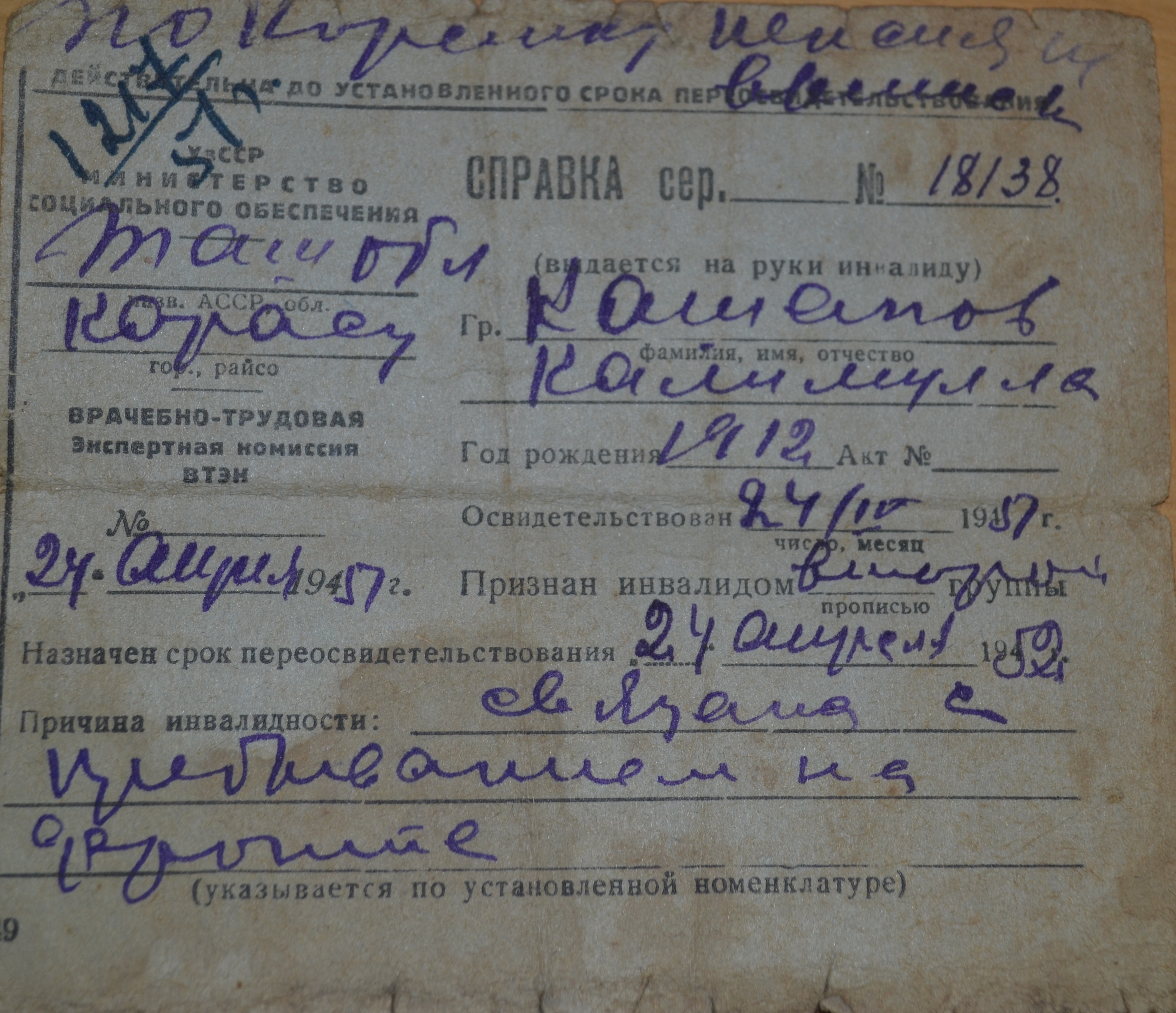 14 ноября 1942 года Калимулла Кашапович получил тяжелое ранение в левую ногу. После трех операций, в июне 1943 года был комиссован. Этим же летом вернулся в родное село.