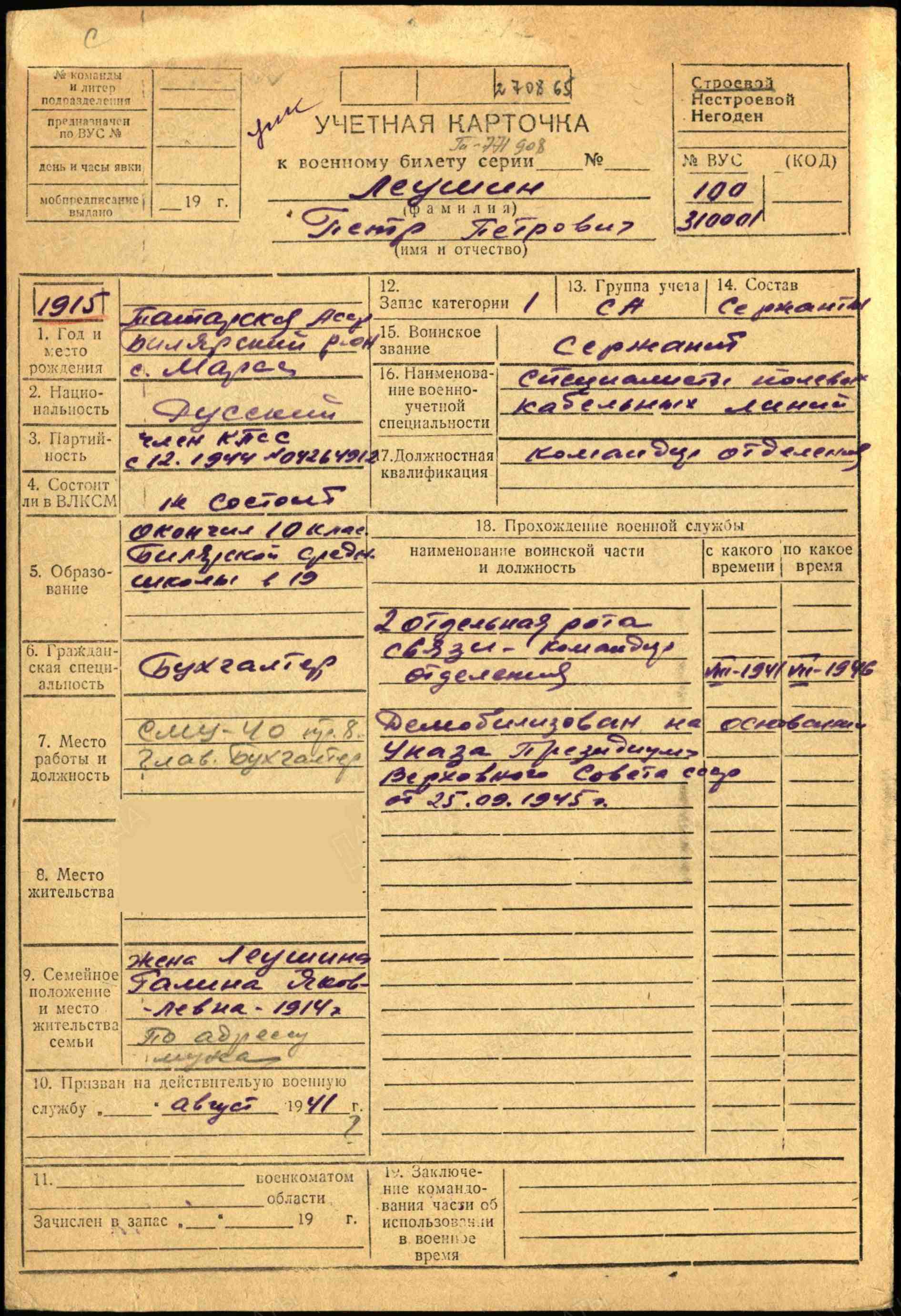 ЛЕУШИН Пётр Петрович, 1915, с. Русская Мараса. Мобилизован в авг. 1941 Билярским РВК. Служил на Дальнем Востоке в подразделениях связи. Сержант, ком. отделения. Член ВКП(б) с 1944. Участник Советско-японской войны. Демобилизован в июле 1946. Награждён медалью «За победу над Японией». После войны жил в г. Альметьевск, работал бухгалтером в СМУ-40.
