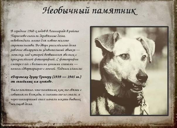pВо время войны подвиги совершали не только люди, но и животные. В блокадном Ленинграде  пёс Трезор почти ежедневно приносил своим хозяевам зайцев и спас от голодной смерти четыре семьи.  В июне 1945 года пёс  подорвался на мине. Благодарные люди поставили ему памятник./p pМемориальный музей им. Ф. Карими/p