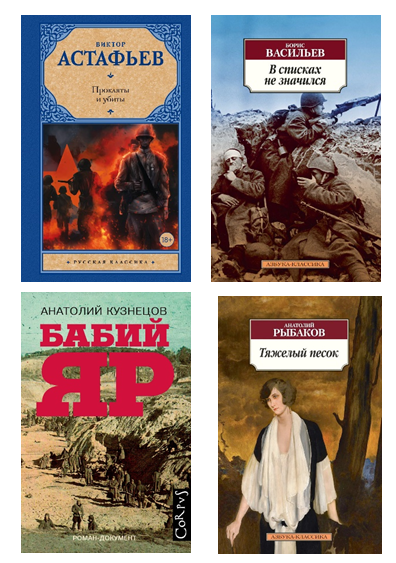 pТема Великой Отечественной войны была и остается одной из ведущих в литературе прошлого и настоящего. Чем дальше уходят от нас события Великой Отечественной войны, тем ценнее становятся художественные произведения – свидетельства страниц нашей истории./p pПредлагаем вашему вниманию произведения авторов, пришедших в литературу непосредственно с переднего края, а также произведения, созданные современниками. Прочтение книг известных авторов поможет осмыслить события Великой Отечественной войны и еще раз познать цену нашей Победы/p pВиктор Петрович Астафьев – выдающийся русский писатель, лауреат Государственных премий СССР и РСФСР. В 1942 году ушел добровольцем на фронт, в 1943 году, после окончания пехотного училища, был отправлен на передовую и до самого конца войны оставался рядовым солдатом. На фронте был награжден орденом «Красной Звезды» и медалью «За отвагу». Пережитое на войне, война, какой видел ее Виктор Астафьев на передовой, стали центральной темой творчества писателя./p pВ романе «Прокляты и убиты» вся неприглядность войны, ее глупости, несуразности перемежаются «простым» героизмом, когда, с точки зрения, солдата это не геройский поступок,а простая работа – тяжелая, кровавая, но которая должна быть выполнена. /p pИ все это передано без излишнего пафоса. Страшные будни и лишения в запасном полку, ужас расстрела братьев Снегиревых заставляет понять, что война начиналась еще/p pвдалеке от передовой и непонятно где страшнее. Время действия романа — поздняя осень 1942 г., место действия — казармы в военном городке, расположенном под Бердском, в Сибири, где призывники 24-го года рождения (ровесники В. Астафьева) должны пройти политическую и боевую подготовку и отправиться на фронт. Но это намерения, а реальность совсем другая. В 21-м стрелковом полку много больных, драки, истязания и даже безнаказанное убийство красноармейца Попцова, совершенное ротным командиром Пшенным, и ответное нападение взбунтовавшегося взвода, чуть было не поднявшего на штыки виновника-офицера. Вершина ужасов — грозный приказ № 227 и начавшиеся показательные расстрелы солдат, невинных братьев Снегиревых./p pРоман «Прокляты и убиты» был задуман в трех книгах, в свое время опубликованы две, предполагалось, что в третьей будет рассказано о сегодняшнем дне фронтовиков, но в последнее время писатель все чаще говорил о том, что силы на исходе и третья книга так и не была написана…/p pРоман-легенда Б. Васильева «В списках не значился» основан на подлинных документах. Как известно, первыми удар Великой Отечественной войны приняли на себя защитники Брестской крепости. Пограничники получили приказ не открывать огонь «на провокации» со стороны противника, они были обречены на смерть и сами это знали, но не отступили ни на шаг. «Человека можно убить, – говорит защитник Бреста, лейтенант Плужников, герой произведения, – но победить нельзя». Разве можно с этим поспорить?/p pГлавным героем является молодой лейтенант Николай Плужников, только-только закончивший училище и направленный для прохождения службы в Брестскую крепость. Он прибыл в крепость 22 июня 1941 года, а через несколько часов началась война. Его нет в списках, неизвестно, где его командир, а где подчиненные, но он принимает бой вместе с гарнизоном. За несколько месяцев из молодого необстрелянного мальчиш