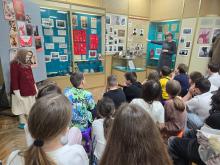 На фоне выставки «Поклонимся великим тем годам!» проводится экскурсия, посвящённая событиям Великой Отечественной войны 1941-
