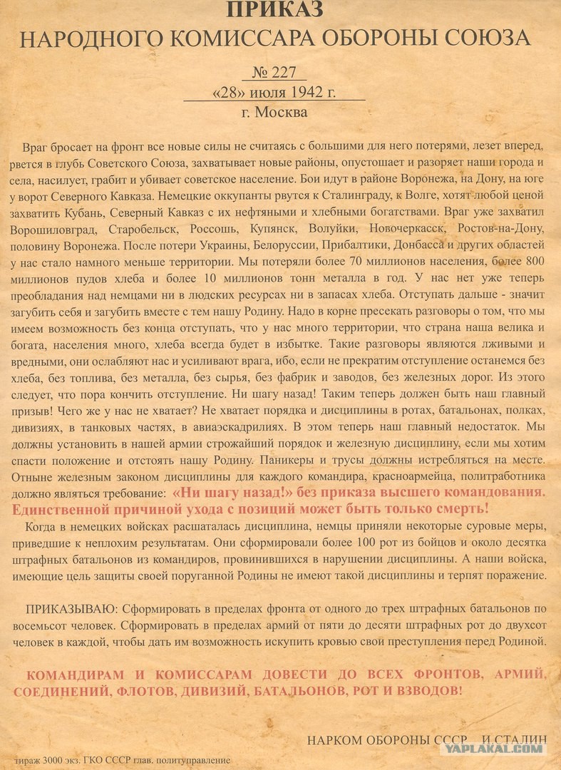 pstrong28 июля 1942 года был подписан приказ №227, оставшийся в памяти народа и в истории как приказ «Ни шагу назад»/strong/p pПервая эйфория от победы под Москвой быстро прошла. Фронт все еще находился в 150 километрах от Москвы, Ленинград находился в страшной блокаде, а на юге был потерян Севастополь. Казалось, было сделано все необходимое, но враг прорвал фронт и захватил Северный Кавказ, рвался к Волге./p pГромкие лозунги: «Беспощадно разгромим и уничтожим врага!», «Смерть немецким оккупантам!» не срабатывали, требовалось что-то другое. Этим другим и стал тот очень жесткий и суровый приказ. В нем отмечалось, что в Красной армии наблюдается крайне низкая дисциплина, поэтому и вводятся суровые меры. Сталину поступали многочисленные письма, где люди просто требовали принять срочные меры, чтобы остановить отступающие войска./p pЭтот приказ стал отрезвляющим душем! Красная Армия отстояла Сталинград и Кавказ и смогла повернуть войну в другую сторону. Начался трудный и долгий путь на запад, на Берлин./p p /p p /p