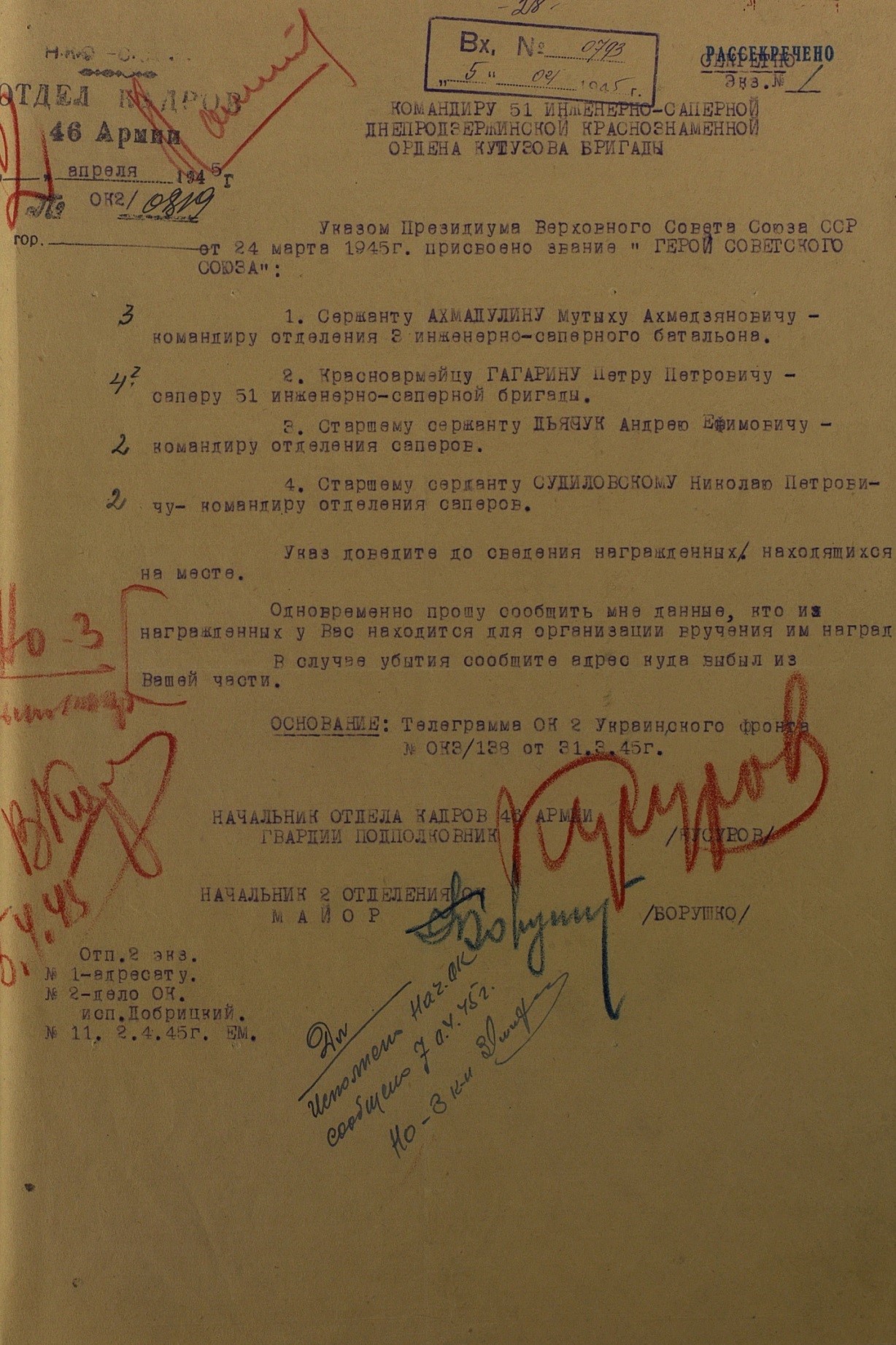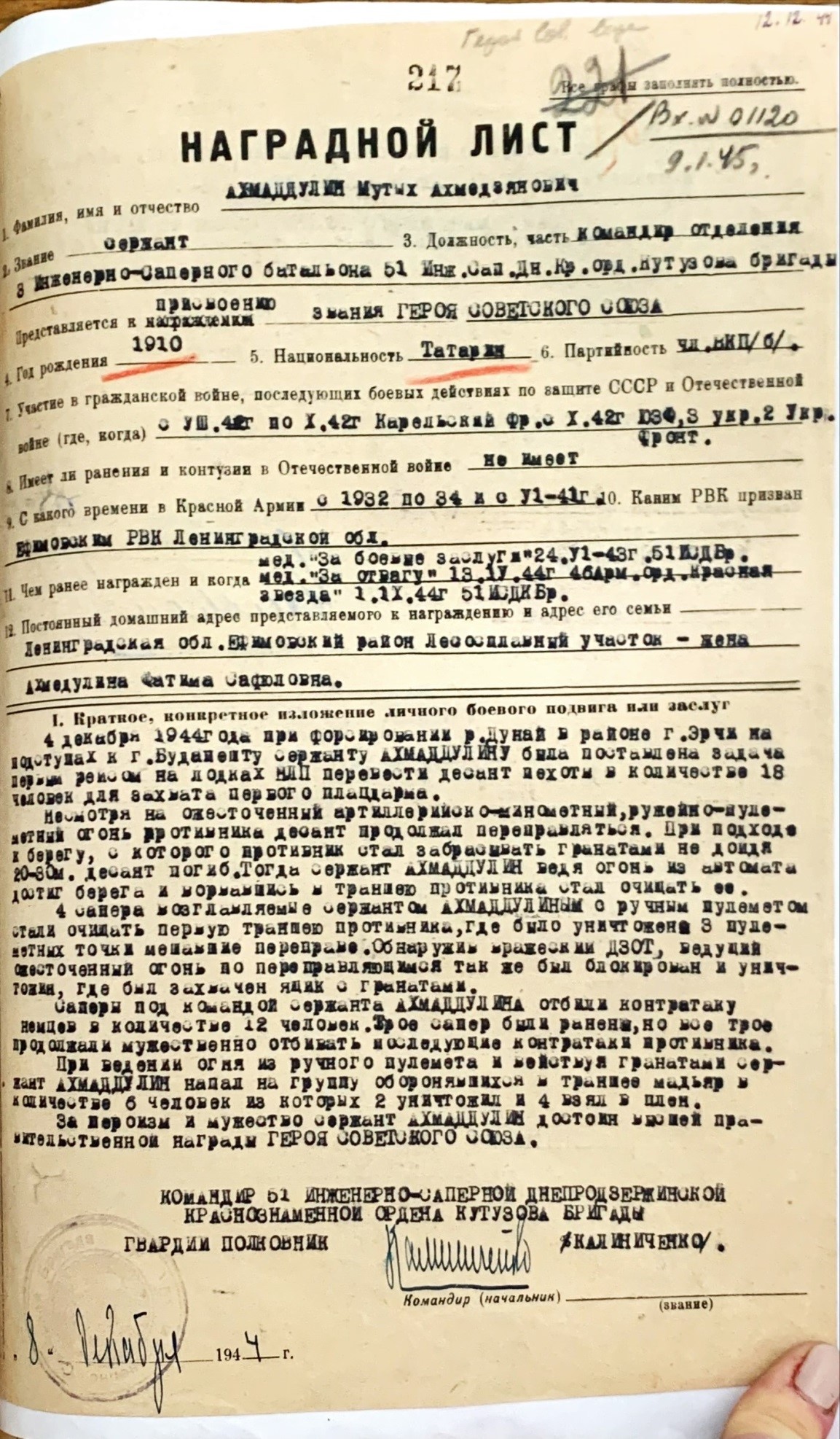 pВторая мировая война стала самой разрушительной в ХХ веке, унёсшей жизни многих миллионов людей. Бесчисленное количество подвигов во время этой страшной войны совершили наши солдаты на фронте, не меньше героизма проявили и работавшие в тылу. Наша задача - сохранить память о тех, кто принёс мир человечеству, поэтому одной из важнейших функций музейной деятельностиявляется патриотическое воспитание подрастающего поколения. На конкретных примерах героических подвигов, жизненных историй людей, родившихся в том городе или деревне, где ты родился и живёшь, легче понять, что такое Подвиг и каким должен быть Герой. Изучение и освещение жизненного пути легендарных личностей, героев Великой Отечественной войны 1941-1945гг., уроженцев Альметьевского района является одной из приоритетных задач сотрудников Альметьевского краеведческого музея. В результате постоянной кропотливой работы, благодаря сотрудничеству с Архивным отделом исполнительного комитета Альметьевского муниципального района (АМР), Военным комиссариатом г.Альметьевск и Альметьевского района РТ, взаимодействию с Поисковыми отрядами заполняются новые страницы в истории Великой Отечественной войны. Так в феврале 2020 года представителями поисковых отрядов «Татнефть-Поиск» и «Высота-116» в МБУ «Альметьевский краеведческий музей» были переданы документы (копии наградных листов, приказов о награждении, журналов боевых действий) Центрального архива Министерства Обороны Российской Федерации (ЦА МО РФ) о боевых действиях третьего батальона 51-й инженерно-саперной бригады 46-й армии второго Украинского фронта, в которых участвовал командир саперного отделения, уроженец с.Урсалабаш Альметьевского района Ахмадуллин Мутык Ахметзянович (1910-1974)./p pАхмадуллин Мутык Ахметзянович родился 12 октября 1910 года в деревне Урсалабаш Альметьевского района Татарской АССР, по национальности татарин. Член КПСС. Накануне войны работал в леспромхозе Ленинградской области. В Красную Армию был призван в 1941 году. Награжден орденом Красной Звезды, медалями «За боевые заслуги», «За взятие Будапешта», «За отвагу», трудовой медалью «За доблестный труд». В Великой Отечественной войне с августа 1942 года. Сержант. Указом Президиума Верховного Совета СССР от 24 марта 1945 года Ахмадуллину Мутыку Ахметзяновичу присвоено звание Героя Советского Союза с вручением ордена Ленина и медали «Золотая звезда» за мужество и героизм, проявленные в бою за плацдарм на правом берегу реки Дунай, южнее Будапешта, в декабре 1944-го./p p /p p /p pМБУ "Альметьевский краеведческий музей"/p p /p
