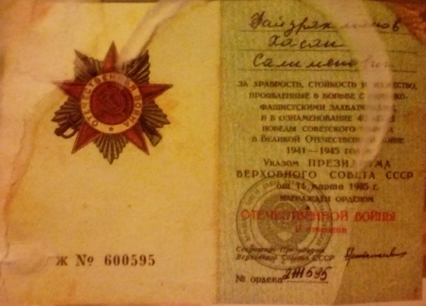 pПрошла война, прошла страда,/p pНо боль взывает к людям:/p pДавайте, люди, никогда/p pОб этом не забудем./p pПусть память верную о ней/p pХранят, об этой муке,/p pИ дети нынешних детей,/p pИ наших внуков внуки./p p(Александр Твардовский)/p pВеликая Отечественная война strongВеликая Отечественная война/strong – сколько боли, страданий, смерти, потерь скрыто в этих словах. Она оставила много, очень много грустных, тяжелых воспоминаний, унесла миллионы жизней, обернулась трагедией для каждой третьей семьи. Мы вырвали победу у врага, которая досталась нам дорогой ценой, ценой целого поколения./p p …22 июня 1941 года рассвет над Родиной был взорван огнём и металлом чудовищной силы. Началась война между СССР и Германией. Советские люди с присущим им патриотизмом и геройством встали на защиту своей Родины. Осознание угрозы фашистского порабощения Отечества придавало его защитникам духовные и нравственные силы, необходимые для успешной борьбы с опасным противником. Девиз «Всё для фронта! Всё для победы!» вошёл в кровь и плоть каждого советского патриота, побуждая, решительным, самоотверженным действиям. Живы еще в памяти старшего поколения голодные и холодные годы войны. Нам надо знать и помнить о своих прадедах, прабабушках, кто воочию ощутил все ужасы войны. А что же позволило в «сороковые роковые» не просто выстоять и победить, но и остаться в этой жестокой борьбе человеком? Какими были те, кому мы обязаны своей жизнью?/p pБольше 77 лет отделяют нас от того исторического дня, когда наши мужественные воины разгромили фашистские полчища и водрузили Знамя Победы над поверженным рейхстагом. В священной борьбе с оккупантами участвовали около 700 тысяч татарстанцев. Одним из них был мой прадедушка со стороны моей мамы – strongФайзрахманов Хасан Салимянович./strong/p p Эта тема заинтересовала меня в прошлом году, когда мы в школе готовились к акции «Бессмертный полк», посвящённой победе в Великой Отечественной войне. Тема очень актуальна, так как мы не должны забывать своих героев и защитников. Я обратился за помощью к своей прабабушке - ФайзрахмановойНурие. Когда она начала рассказывать про моего деда, мне стало немножко неловко за то, что я не поинтересовался о его судьбе, боевом пути его раньше! Сразу возникли вопросы: где же мой прадедушка воевал? В каких войсках? Какой вклад внёс в победу над фашистской Германией? Какие были заслуги, награды?/p pО войне Советского Союза против фашистской Германии мы, нынешнее поколение, знаем по рассказам очевидцев. Но их живых, среди нас остается все меньше и меньше. Война, затаившаяся в их ранах, преждевременно уносит их жизни. Мы должны спешить. Мы должны подробно записать историю Великой Отечественной войны. Это наш долг перед теми, кто рисковал жизнью за нас./p pМой прадедушка strongФайзрахманов Хасан Салимянович/strong Родился он 24 июня 1923 года в деревне Нижние Чершилы Лениногорского района Республики Татарстан. С 14-ти лет работал в колхозе, закончив в 1933 году 4 класса сельской школы. Руки его с малых лет научились держать топор. Он стал плотником. В деревне создавались трудовые артели. Таких, как он, молодых плотников набралось 5-6 человек. Работали с задором: молодость и сила не давали уставать./p p21 июня вся деревня готовилась отпраздновать национальный праздник Сабантуй. Несколько молодых людей с раннего утра собрались и поехали в районн