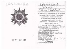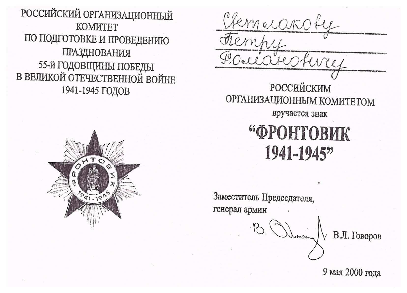 Светлаков Петр Романович родился 29.06.1927 года, ТАССР Акташский район в селе Аппаково. В 1931 году окончил шесть классов Кичуйской семилетней школы. Работал в колхозе «Восход» села Аппаково конюхом до 1944 года. В 1944 году ушел на фронт. На войне был контужен. В госпитале находился 6 месяцев. В ноябре 1945 года вернулся домой. Продолжал работать конюхом в колхозе. В 1952 году уехал учиться в г. Бугульму учится на тракториста, окончил в марте 1953 года. Работал в Акташском МТС трактористом. В октябре 1958 года уехал учиться на шофера в г. Альметьевск, окончил в феврале 1958 года. Работал в колхозе «Восход» до 1978 года шофером. С 1978 года работал заведующим МТФ. С 1980 года работал заведующим гаражом механической мастерской. С 1080 года по 1984 года являлся народным заседателем Альметьевского народного суда ТАССР. С 1993 по 1996 годы был председателем Совета Ветеранов Аппаковского сельсовета. С 1999 года инвалид 2 группы.
