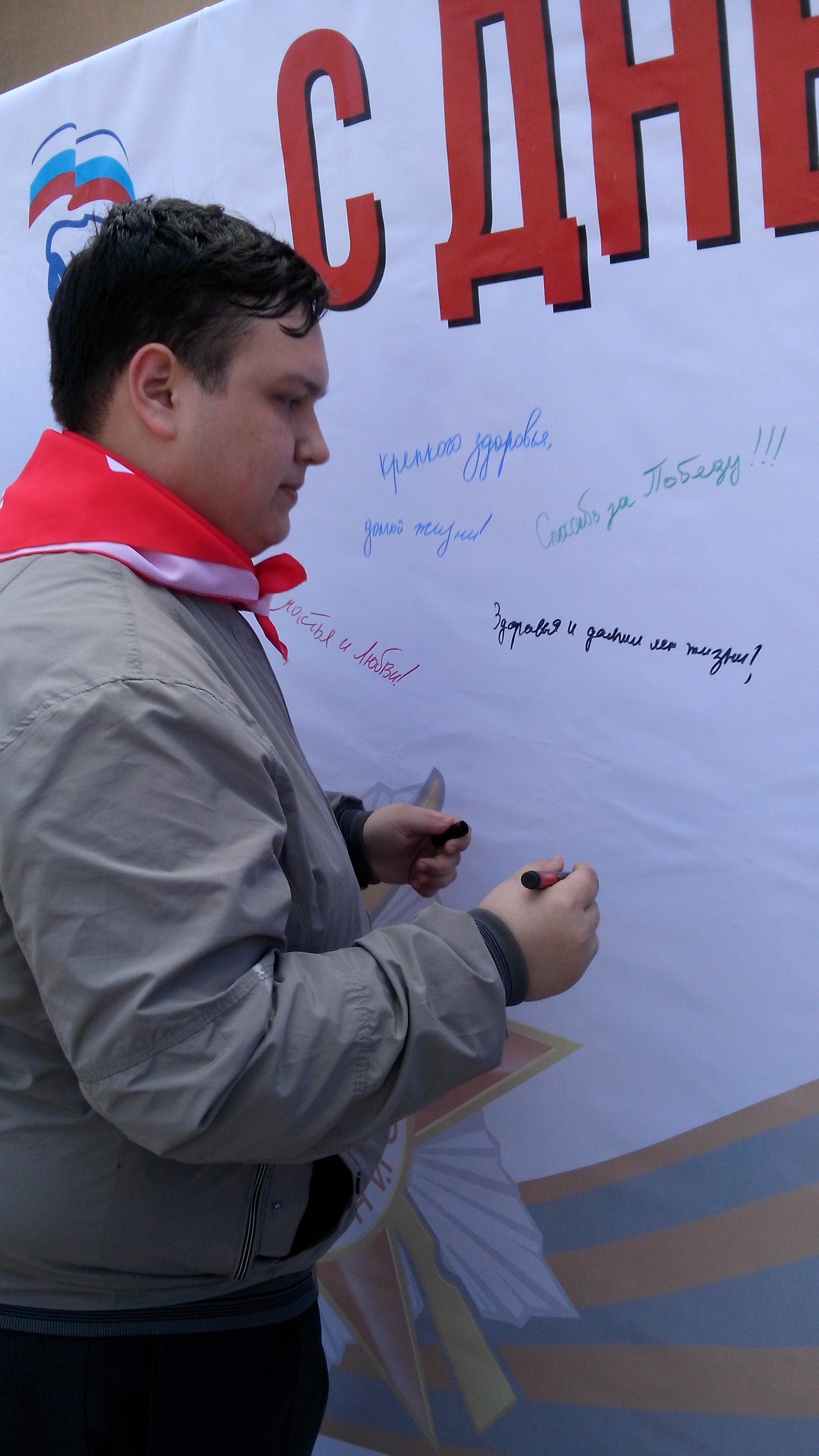 pem08.05.2018 г. /emВ честь празднования 73-летия Победы в Великой Отечественной войне в рамках федерального проекта «Старшее поколение» партии "Единая Россия" на площади возле Молодежного центра прошла патриотическая акция «Пожелания ветеранам». Все желающие могли написать свои пожелания ветеранам. На чистом полотнище альметьевцы в этот день оставили свои поздравления ветеранам Великой Отечественной войны. На фоне баннера волонтеры читали стихи о войне, активисты общественной организации «Молодая гвардия» раздавали прохожим Георгиевские ленточки. Здесь же был организован конкурс на лучшее время сборки и разборки автомата Калашникова./p pВажно отметить, что в рамках федеральных партийных проектов «Старшее поколение» и «Историческая память» в городе и районе проходят акции, приуроченные в празднованию Дня Победы. Активисты и сторонники партии «Единая Россия», волонтеры навещают ветеранов войны, тружеников тыла, вдов на дому, вручают им подарки и поздравительные открытки, оказывают помощь по хозяйству./p