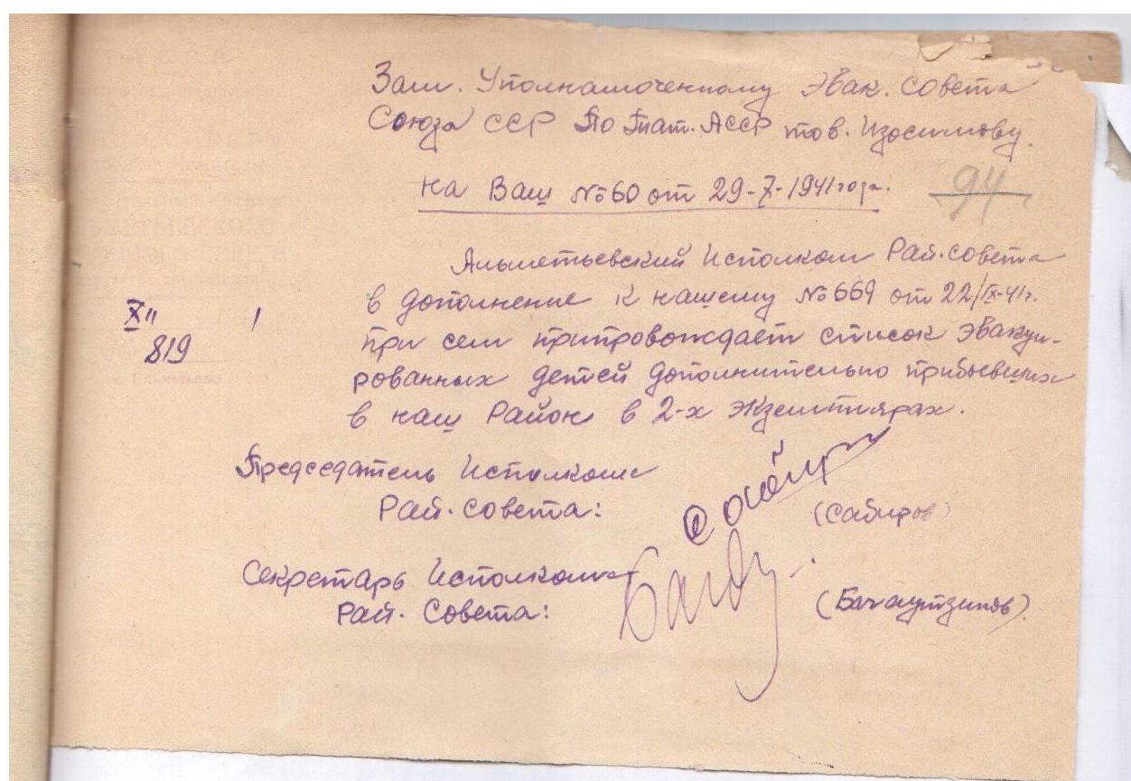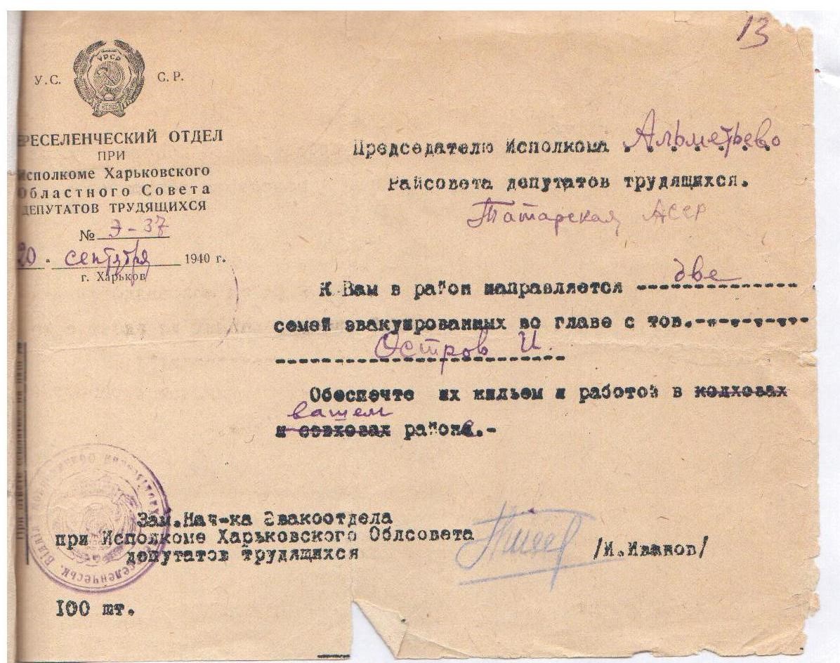 pВеликая Отечественная война 1941 – 1945 г.г. вошла в каждый дом, в каждую семью нашей страны. Война была не только на фронте,она шла и в глубоком тылу. Горожане и сельчане жили по законам военного времени./p pС первых дней войны началась эвакуация граждан из прифронтовых районов на территорию Татарской АССР. В годы Великой Отечественной войны в Татарстан было эвакуировано из западных областей страны, Москвы и Ленинграда более 70 заводов и фабрик, научно-исследовательских институтов, почти 270 тысяч тружеников и их семей. Все эти предприятия были быстро размещены, смонтированы и вступили в строй действующих./p pРабота по приёму, размещению, обеспечению и трудоустройству эвакуированных была организована и в Альметьевском и Акташском районах./p pК началу войны в Альметьевском районе проживало 35 400, в Акташском – 21 430 человек. В 1941 – 1945 гг. жители этих районов приняли большой поток эвакуированных граждан. Только к ноябрю 1941 года из оккупированных регионов сюда прибыло около 3 500 человек, в том числеболее 2000 детей. К концу 1944 года из фонда помощи эвакуированным было выдано пособий на сумму 15 816 рублей./p pДля координации работы по их приёму было организовано эвакуационное бюро. Люди, прибывшие из охваченных войной районов, были распределены по 23 сельсоветам и 48 колхозам. Эвакуированные заметно пополнили истощённые мобилизацией трудовые ресурсы района./p pВ довоенный период Альметьеский район имел четко выраженную сельскохозяйственнуюнаправленность. Поэтому большинство эвакуированных, так же, как и основная масса местного населения, была занята в аграрном производстве.Большая часть продукции, производимой в обезлюдевших колхозах и совхозах, направлялась на фронт. Сельские труженики,сами употреблявшие в пищу траву, крапиву делились с эвакуированными буквально последним куском хлеба. Были и конфликты, и недоразумения, но в тяжёлую годину советский народ сплотился в едином порыве - выстоять и победить./p p /p pem(к публикации прилагаются сканы документов из архива Альметьевского района, фотографии экспозиции /em/p pemАльметьевского краеведческого музея)/em/p pem С. Султанова./em/p