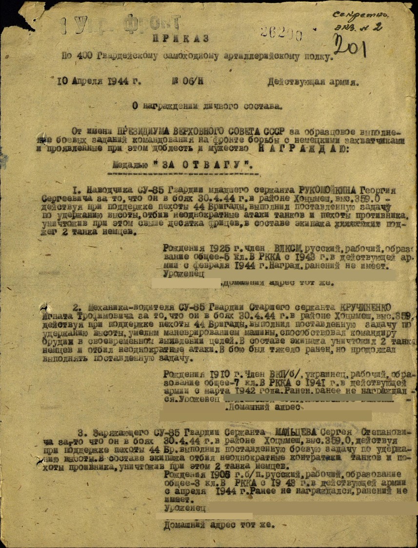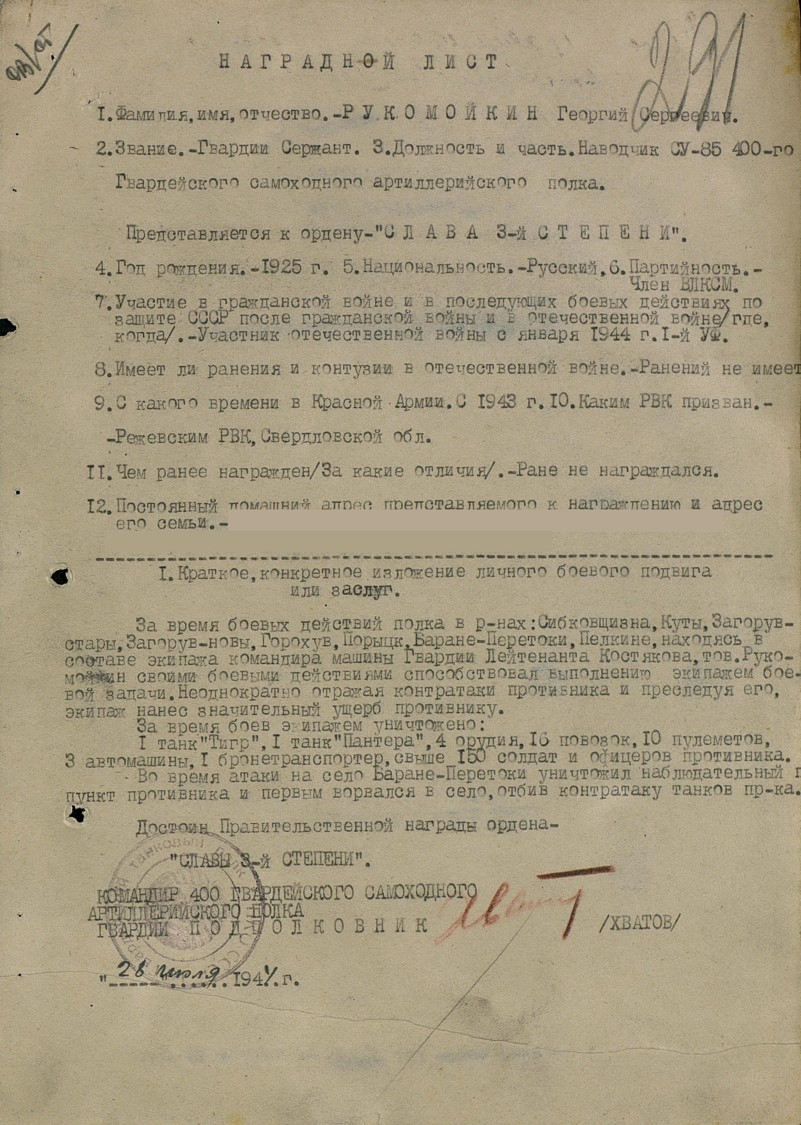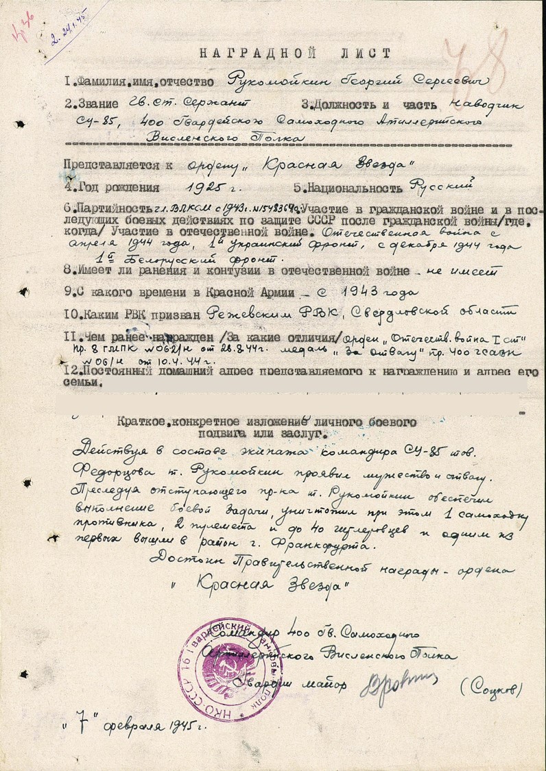pemТот самый длинный день в году С его безоблачной погодой/em/p pemНам выдал общую беду -/em/p pemНа всех. На все четыре года. Она такой вдавила след,/em/p pemИ стольких наземь положила,/em/p pemЧто двадцать лет, и тридцать лет Живым не верится, что живы./em/p pemИ к мертвым, выправив билет, Все едет кто-нибудь из близких. И время добавляет в списки Еще кого-то, кого-то нет./em/p pemИ ставит, ставит обелиски./em/p pemКонстантин Симонов/em/p p /p pЯ, Жаркова Анастасия, хочу рассказать вам историю своей семьи. Всегда думала, что мои родные самые обычные люди. Готовясь к конференции, просмотрев документы, государственные архивы, с удивлением узнала, что семья у меня большая и география ее очень широкая: Москва и Иркутск, Крым и Урал, Краснодар и Бугульма, Тетюши и Караганда с Днепропетровском. Все мои родственники – люди активные и трудолюбивые, поэтому-то их и разбросало по свету./p pА началось все в далеком 1941 году на Урале, в городке Артемовск. Тогда на фронт из семьи моего прадеда Рукомойкина Георгия Сергеевича ушли все мужчины – 5 братьев. А через два года, когда прадеду Георгию исполнилось 18 лет – ушел добровольцем на войну и он, проработав на военном заводе два года. Его бабушка Соломия все годы войны молилась за своих пятерых сыновей и внука, и они все вернулись домой живыми./p pМой прадед Георгий гвардии старший сержант был наводчиком в танке СУ-85 в 400-м Гвардейском самоходном артиллерийском полку с 1944 года Первого Украинского фронта, а затем Первого Белорусского фронта. Командир экипажа, в котором прадед воевал, был учителем истории, и прадед Георгий всегда вспоминал о нем с уважением. С первых дней экипаж оказался в самом «пекле» фронта. Враг отчаянно сопротивлялся, из последних сил стараясь удержаться на советской земле. Уже в апреле 1944 года мой прадед/p p /p pГеоргий награжден медалью за Отвагу - за поджег 2-х танков и уничтожение более десятка фашистов./p pВ июле 1944 года на западном берегу Вислы экипаж уничтожил несколько танков, 3 орудия и 100 гитлеровцев. 22 августа расстрелян из засады танк Тигр Королевский и Тигр и 40 фашистов, экипаж не покинул рубеж. За этот подвиг он получил награду – орден «Отечественной войны» 1 степени./p pС 15 по 20 января 1945 г. прадед и его товарищи уничтожили 27 автомашин, 5 пушек, 4 пулемета и более 80 гитлеровцев. Это был третий подвиг и награда - орден «Отечественной войны» 1 степени./p ol liфевраля 1945 года Экипаж одним из первых ворвался во Франкфурт, уничтожив 1 самоходку, 2 пулемета, 40 гитлеровцев. Наградили за данный подвиг орденом Красной звезды./li /ol pВсе ближе был разгром фашизма, и тем яростнее сражались наши воины. Приходилось передвигаться максимально быстро по дорогам Европы, чтобы скорее достичь Берлина и покончить с гитлеровской армией./p pПрадед участвует в освобождении Польши, и получает медаль за освобождение Варшавы./p pСамая главная битва была впереди – битва за Берлин. Кровопролитные бои закончились славной Победой! Прадед Георгий расписался на покоренном Рейхстаге: «Рукомойкин Георгий, город Артемовск». Наградой была медаль/p p«За взятие Берлина» и медаль «За победу над Германией в Великой Отечественной войне»./p ol liмая война закончилась, а военная служба еще продолжалась для многих солдат и офицеров. И мой прадед Георгий должен служить в Кенигсберге еще 3 года, он был молод, не женат и не ранен, поэтому и оставлен на западном рубеже./li /ol pВ 19