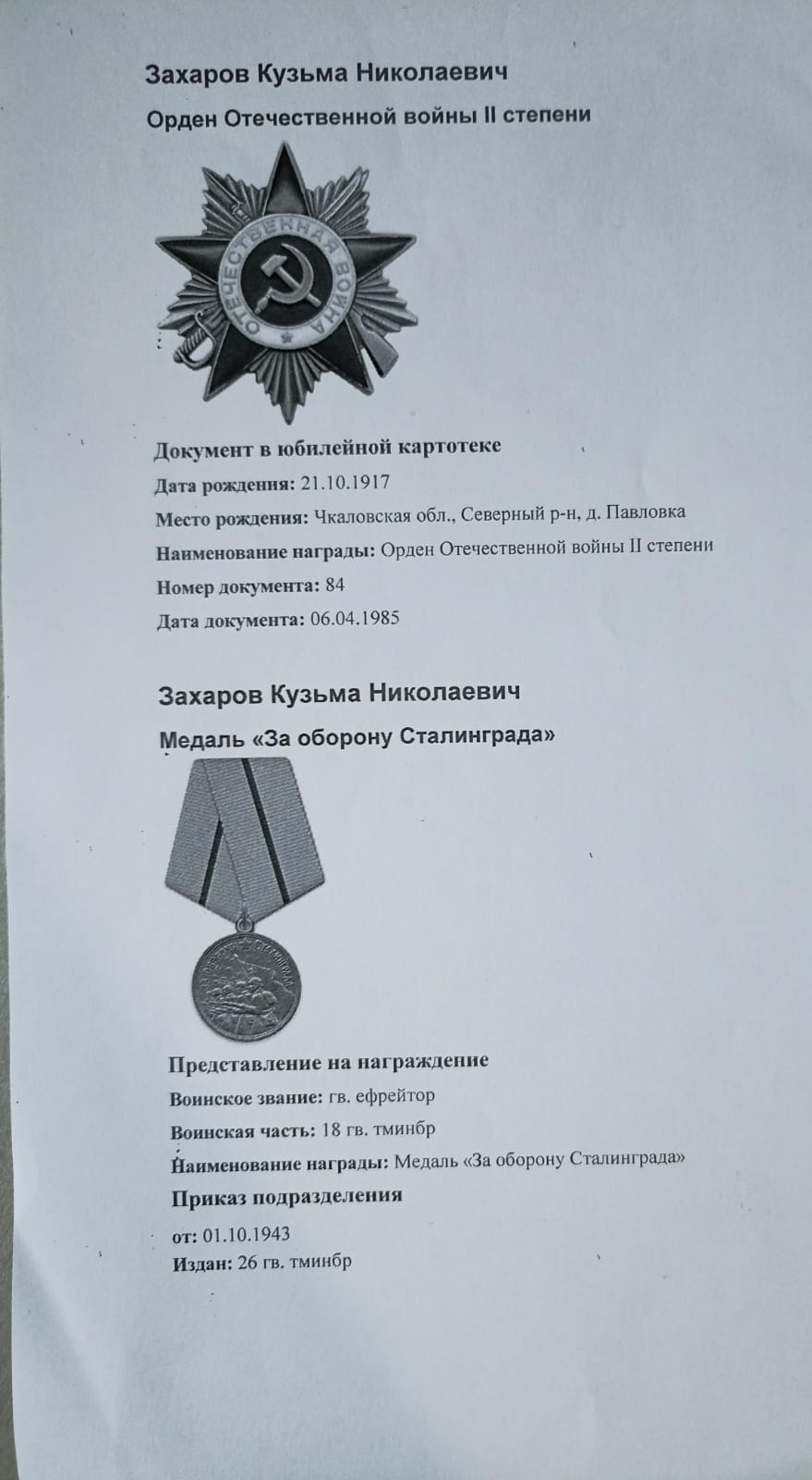 pЗахаров Кузьма Николаевич родился 21.10.1917 г в деревне Павловка Чкаловской области.br / Место призыва - Секретарский РВК Чкаловской области.br / Дата поступления на службу: 05.09.1939г.br / Место службы: 26 гвардейская минометная бригада 2 гв. Минометная дивизия11гв.А1 Прибалтийский фронт.br / Воинское звание: гвардии ефрейтор.br / Дата подвига: 03.07.1944г. №13/н, награжден Медалью «За Отвагу».br / Во время выполнения боевой задачитретьего июля 1944 года в районе деревни Струнино Ленинградской области, при подъезде к огневой позиции на машине товарища Захарова К.Н. был поврежден осколком вражеского снаряда радиатор. Не взирая на огонь, благодаря энергично принятым мерам Захаров К.Н. устранил неисправность и своевременно доставил боеприпасы на огневую позицию/p