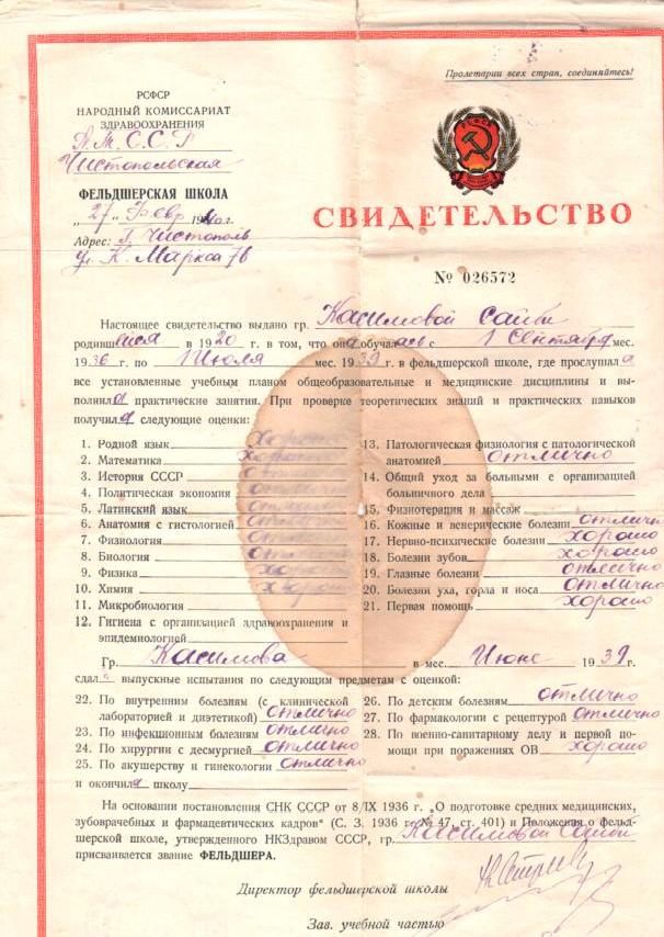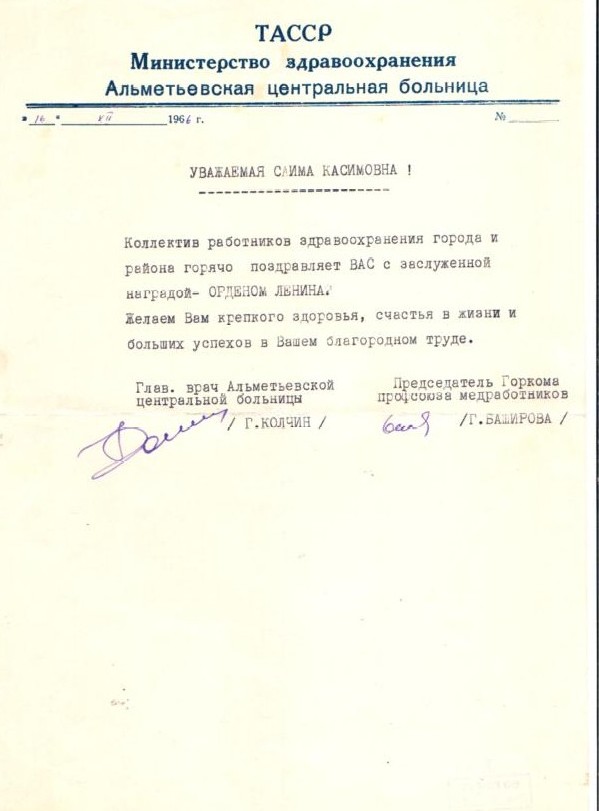 Мин 1941 елның август аенда Чирмешән районы ( Әлмәт районы) Елховой авылына фелдшер-акушерлык пункытына мөдир булып эшкә килдем һәм 45 ел инде эшемне дәвам итәм.Ул чагында аерым медпункт йорты юк иде. Мин үземнең аз-маз даруларым,вак-төяк инструментларым белән сумкамны күтәреп,авылның төрле почмакларындагы буш йортларда эшләп йөрдем.