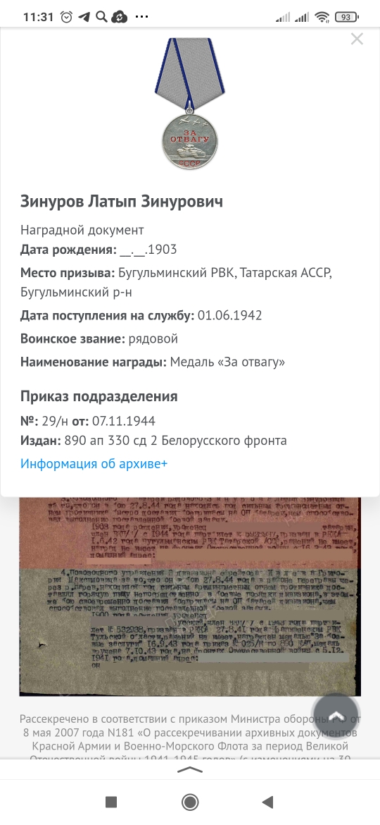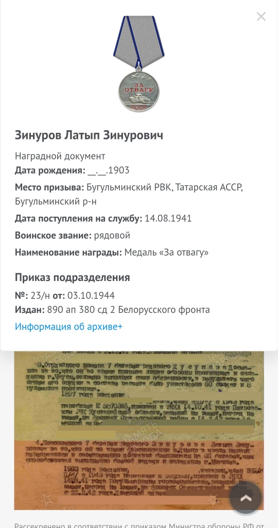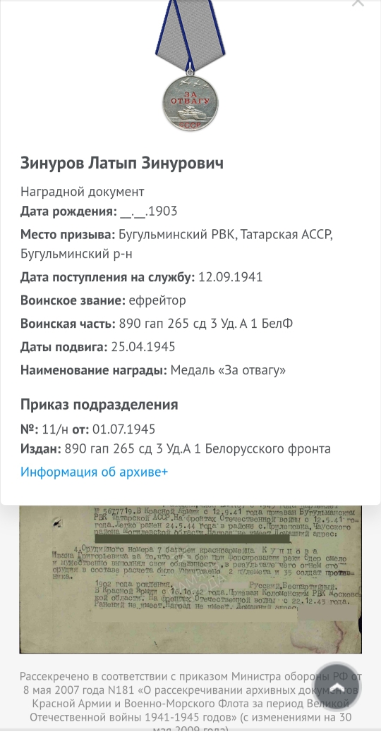 pЗиннуров Латыйп Зиннур улы 1903нче елның 1 нче гыйнварында Татарстан республикасының Әлмәт районы Урсалабаш авылында туа. Гаиләдә 5 бала була алар. 3 малай һәм ике кыз. Сугыш башлангач, Латыйп, Талыйп һәм Харис туган җирләрен фашистлардан сакларга дип фронтка китәләр. Харис сугышта хәбәрсез югала. Латыйп белән Талыйпка исән-имин туган җирләренә кайтырга насыйп була./p p Зиннуров Латыйп Зиннур улы сугышка 1941 нче елның 14 нче августында китә. Тормыш иптәше Шәмселбанат өч баласы белән аны Бөгелмә тимер юл вокзалыннан озатып кала. Сугышта Латыйп ефрейтор була. Бик күп батырлыклар эшли, шуның өчен күп тапкырлар бүләкләнә. Днепр елгасын аркылы кичкәндә, ул, беренчеләрдән булып, ярның икенче ягындагы пулемет-артиллерия батальонына сугыш кирәк-яракларын алып чыга. Шуның нәтиҗәсендә хәрби бурычын үтәп, Могилев шәһәрен алуда зур өлешен кертә. 1944 нче елның 27 нче августында, дошманның көчле артминет уты астында булуына карамастан, пулемет-артиллерия батальонына сугыш кирәк-яракларын тиз арада китереп җиткерә. Бу батальонга куелган хәрби бурычны үтәргә ярдәм итә. 1945 нче елның 25 нче апрелендә Одер елгасы тирәсендә дошманның уты астында сугыш кирәк-яракларын турыдан-туры ут позициясенә китереп, артиллерия утын өзлексез алып баруны тәэмин итә. Латыйп Зиннур улы Берлинга кадәр барып җитә. 1943 нче елның 20 нче августында аңа "Сугышчан казанышлары өчен"медале тапшырыла. 03.10.1944, 07.11.1944, 25.04.1945, 01.07.1945 - "Германияне Җиңгән өчен"медальләре белән бүләкләнә. 1956 елда вафат була./p p /p p /p pГәрәева Гөлмира Абдулла кызы,/p pтуган (татар) теле һәм әдәбияты укытучысы,/p pТатарстан Республикасы Әлмәт муниципаль районы/p pмуниципаль бюджет гомуми белем учреждениесе/p p“Галеев Р.Г. исемендәге Сөләй урта гомуми белем мәктәбе”/p p /p