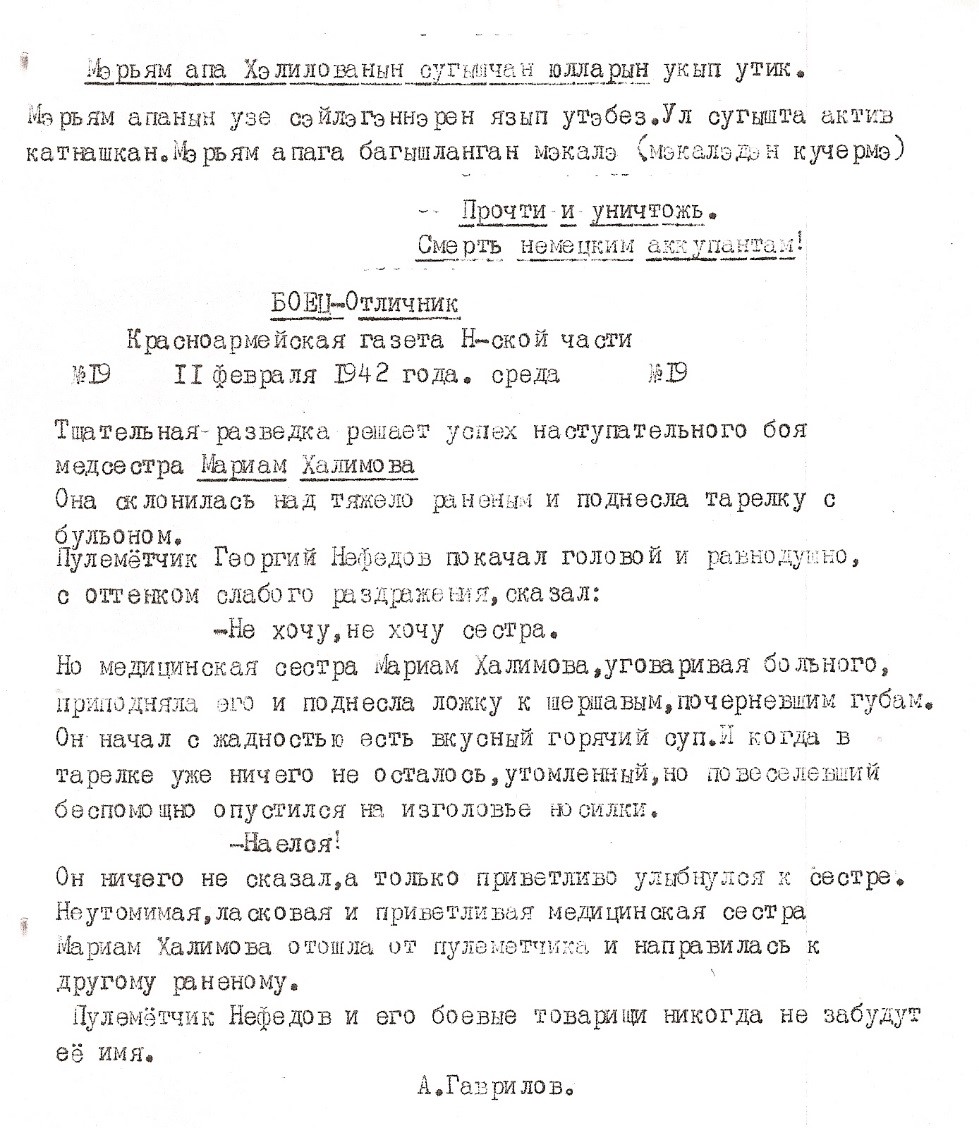 pМәрхәмәтегез, олы җаныгызның/p pШифасыннан йөзләр нурлана./p pСез, шәфкать туташлары,/p pИлнең асылташлары,/p pИгелеккә һәйкәл дөньяда./p p Сугыш! Шушы кыска гына сүз эченә күпме нәфрәт, күз яшьләре, күпме каргыш сыйган. Ул күпме балаларны газиз ата–аналарыннан аерды, аларның чәчәк кебек гомерләрен аяк астына салып таптады. Сугыш аркасында күпме авыллар, шәһәрләр бомбага тотылды һәм алар урынында хәрабәләр генә калды. Бу фаҗига китергән афәтләрне санап та, сөйләп тә, аңлатып һәм күрсәтеп тә бетерерлек түгелдер.../p p Егерме ике, июнь, кырык бердә,/p p Җиргә афәт килде ул көнне./p p Сугыш каһәрләгән шушы көнне/p p Мөмкинме соң оныту, мөмкинме../p pИлебезгә хыянәтчел рәвештә фашист илбасарлары басып керә. Ләкин, ничек кенә булмасын, халкым югалып калмый. Туган илен чиксез яраткан, курку белмәс, аның өчен үләргә дә әзер булган ир-егетләребез, кулларына корал алып, сугышның беренче көннәреннән үк, туган авылларын, шәһәрләрен, газиз җирләрен немец гаскәрләреннән азат итәргә ашкыналар. Алар үзләренең көчләрен дә, гомерләрен дә, хәтта җаннарын да кызганмыйлар. Шушы патриотлар арасында безнең авыл кешеләре дә булган. Мәмәт авылыннан сугышка 210 нан артык кыю, асыл ир-егет киткән. Кызганычка каршы, шул авылдашларыбызның 77 се генә туган авылына әйләнеп кайткан./p pБөек Ватан сугышына киткән авылдашларыбыз арасында авылның иң чибәр, батыр кызлары: strongРазыйфа апа, Мәрьям апа, Сылу апа, Латыйфа апалар/strongда булган. Әлеге язмамны шушы кызларның берсе – игелекле шәфкать туташы strongemХалимова Мәрьям Хәлил кызына багышлыйм/em/strong. Ул сугышның беренче көненнән үк фронтка шәфкать туташы итеп алына, һәм соңгы көннәренә кадәр үз вазифасын җаны – тәне белән бирелеп башкара. Ул 1920 елның 1 сентябрендә Әлмәт районы Мәмәт авылында туган. Яшүсмер елларында авылның гүзәл табигатендә нурланып, хозурланып үсеп буйга җиткән. Ләкин аяусыз сугыш аның язмышын үзенчә хәл иткән: ул сугышның беренче көннәреннән үк сугышка алынган. Аның бу аяусыз афәт турындагы истәлекләренә күз салып үтик: /p p «…Мине 1941 елның августында сугышка алдылар. Аңа кадәрле мин Әлмәт районы Колшәрип авылында медпункт мөдире булып эшли идем. Башта кызлардан мин берүзем генә идем. Безне Бөгелмәгә алып киттеләр. Анда торганда тагын кызлар өстәлде һәм без бер батальон булдык. Бу медсанбат иде. Кызлардан исемдә калганнары Пушкова, Захарова, Саламатникова, Александрова, Чернова, Хвалеева, Шкитманнар һәм врачлар бар иде. Без анда ике айлап тордык. Җылы киемнәр бирделәр, төрле занятиеләр булды, сугыш коралларын өйрәндек. Төннәрен госпитальдә эшләдек. Чөнки бу вакытта инде сугыштан бик күп яралыларны кайтаралар иде. Анда эшләгәндә яралыларга беренче ярдәм күрсәтергә, ничек сугыш кырыннан алып чыгарга, ничек тылга озатырга, палаткаларны ничек корырга һәм анда ничек операцияләр үткәрергә өйрәндек. Безнең өчен бу бик яхшы уку, кирәкле практика булды. Шунда ук присяга кабул иттек. 7 ноябрь көнне сугышчан парадта йөрдек һәм шул ук көнне Бөгелмәдән чыгып киттек»./p pМәрьям апа үзенең истәлекләрендә Мәскәү, Солнечногорск, Калинин, Смоленск шәһәрләрендә булуы, көн – төн яралыларны каравы, аларга медицина ярдәменнән тыш өс – башларын юу, ашату кебек эшләр башкаруы, төннәрен дә операция ясаулары, һәрвакыт күченеп йөрүләре (чөнки фронт гел хәрәкәттә) турында да искә ала./p pӘйе, сугыш ул уен түгел. Илең өчен батырларча көрәшк