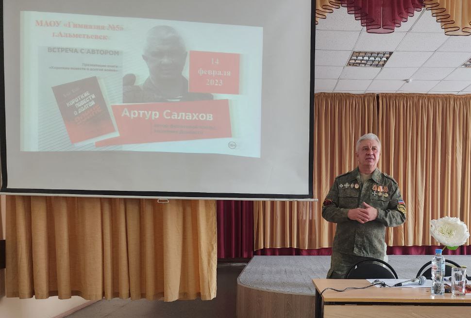p2023 нче елның 14 нче февралендә 5 нче гимназиянең өлкән сыйныфы укучылары әлеге исемдәге китапның авторы Артур Әсхәт улы Сәлахов белән очраштылар//p pЯзучының балалык һәм мәктәп еллары Татарстан нефтьчеләренең башкаласы - Әлмәт шәһәре белән бәйле. Һөнәре буенча югары белемле икътисадчы, Армия хезмәтеннән соң Көнбатыш Себер предприятиеләрендә зшләгән. Ә инде Донбасс җирләрен азат итү буенча махсус хәрби операция башлангач, үзе теләп фронтка китә.../p pАртур Әсхәтулы әле күптән түгел генә Донбасстан кайткан. Шуңа күрә ул үзенең әсәрендә илебез бөтенлеген саклау өчен барган көрәш вакыйгаларын тәэсирле итеп сурәтли. Китапны тәкъдим итү буенча ясалган чыгышлардан соң, аңа сораулар бирдек./p p /p p- Бүгенге фронтовик-язучылар алдында нинди бурычлар тора?/p p- Сугыш корбаннарсыз булмый. Ләкин кеше гомере халык хәтерендә күпме сакланса,шулкадәр дәвам итә, - дип җавап бирде ул. - Рус һәм татар классикларының әсәрләре буенча без Ватаныбыз азатлыгы өчен башларын салган күпме каһарманның исемен хәтеребездә саклыйбыз. 1941 -1945 еллардагы Ватан сугышын гына алыйк... Фронт язучыларның әсәрләрендә бирелгән каһарман –сугышчы образлары безнең милли аңыбызга сеңгән.Бүген язучының бурычы –Ватаныбыз тарихын ясаучы Каһарманнарны мәңгеләштерү./p p- Сугыш темасына тагын язарга уйлыйсызмы?/p p- Сугыш күпме дәвам итсә,шулкадәр язачакмын,-дип җавап бирде әңгәмәдәшебез.- Ә инде дөньяда тынычлык урнашкач, нәрсә турында язарга кирәклеген тагын хәл итәчәкбез./p p- Китап укучыларга теләкләрегез нинди?/p p- Тынычлык. Бу сүз бүген бик зур мәгънәгә ия. Тынычлык - Җирдә тормышның дәвам итүе дигән сүз./p p /p pХәйретдинова Римма Ильинична,/p pӘлмәт шәһәре 5 нче гимназиясенең/p pтэрбия эшләре буенча директор урынбасары/p p/p