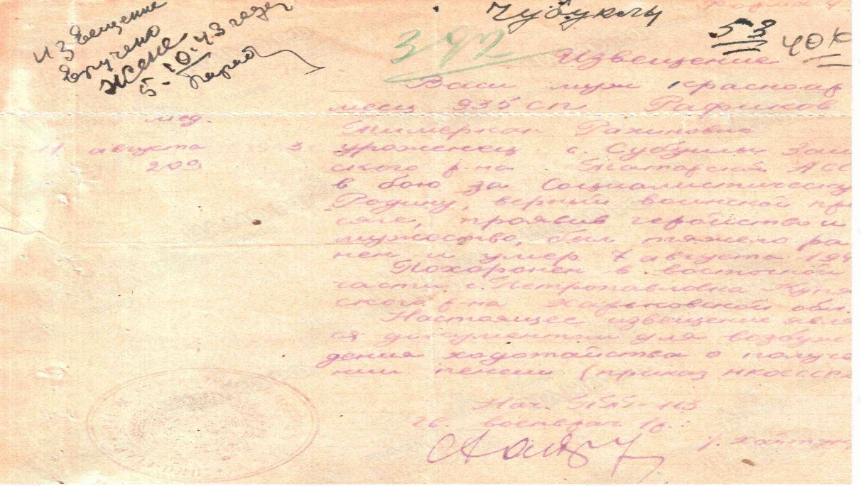 Опубликовано пн, 27/02/2023 - 16:49 пользователем TatFrontu.ru pТатарстанның Зәй районы зур түгел, әмма сугыш йоткан уллары бихисап./p pРафиков Рәхим бабайның ике улы гаиләләре белән, Чыбыклы авылында өйгә хуҗа итеп Тимерханның өлкән улы Биктаһирны калдырып, 1940 елда Ленинградка вербовка белән заводка эшләргә китә. Сугышның беренче көннәреннән абый кеше – Тимерханны, энесе – Мәрдехан белән сугышка алалар. Табылган архив документларында 1906 елгы Мәрдеханның призыв датасы булып 24.06.1941 тора. 24 нче июньдә ире сугышка алынгач, хатыны Галимә, кечкенә кызы Мөслимәне кочаклап, килендәше Минҗамал, аның кечкенә һәм үсмер балалары белән, кире Татарстанга озатыла. Поезд белән алар бер ай буе ачлы-туклы кайталар. Поезд көндез туктап тора, караңгы төшкәч кузгала иде, - дип сөйләгән әби оныкларына. Юл авыр була, Тимерханның кечкенә кызы Тәслимәне саклап кала алмыйлар, бала авырып үлә. Кызны тимер юл буенда, туган җиреннән ерак һәм хәзер туганнары да белмәгән төбәктә күмеп калдыралар./p p Сугыш абый белән эненең юлларын аерып төрле фронтларга ыргыта. Мәрдеханның гомере, 1942 нче елда өзелә. Кырык икенең 24 мартында үтерелеп, Ленинград өлкәсенең Шамокша авылында, юл буендагы зиратка күмелүен хәбәр итә архив документы. (a href="https://www.kremnik.ru/node/279170"https://www.kremnik.ru/node/279170/a)Кыска гына вакыт эчендә дә күпме кан, үлем, авырту һәм яшь күргән әлеге 26 яшьлек татар егете, киләчәккә якты хыяллар баглап үскән авыл малаеның кызы – Мөслимә, үсеп, кияүгә чыга, ике кыз бала табып үстерә. Хәзерге көндә ул кызларның да оныклары егет-кызлар инде. Барысы да Зәй районында гомер итә. Бик күркәм, итәгатьле, тәрбияле Мәрдеханның дәвамчылары./p p Тимерхан энесеннән озынрак гомерле була. Ул, мөгаен, искиткеч вәхши фашизмны илебез җиңәчәкне белеп үлгәндер. Һәр чакрымын кеше гомерләре хисабына көрәшеп алган булса да, азат ителгән җирләргә сөенгәндер. Стрелковая дивизия сугышчысы,рядовой Рафиков Тимерхан 1943 елның 5 августында яраланып, эчке органнары каты яраланудан 7 августта Харьков өлкәсендә үлә. Купянский районының Петропавловка авылының көнчыгыш ягында күмәк кабергә күмелгән. (a href="https://obd-memorial.ru/html/info.htm?id=17355344"https://obd-memorial.ru/html/info.htm?id=17355344/a) Тимерханның уллары-кызларының оныклары инде 30-40 яшьлекләр бүгенге көндә. Һәммәсе бабаларына лаеклы чын кеше булып, сугыш юк иткән туганнарынын рухын сөендерерлек итеп, җирдә матур эз калдырырга тырышып гомер итә./p p /p p10 нчы мәктәпнең туган (татар) тел укытучысы/p pӘхмәтҗанова Энҗе Таһир кызы/p Прикреплённые изображения: Источник: https://tatfrontu.ru/node/918060 Язык: Татарский
