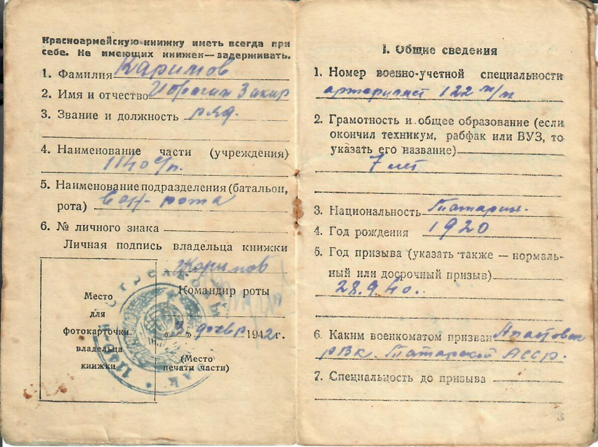 pБабамstrong Кәримов Ибраһим Закир улы/strong 1920 нче елның 13 нче июнендә Апас районы Югары Ындырчы авылында туган./p p20 яшендә Кызыл Армия сафларына алына. Бу хакта бабам болай дип сөйли иде: /p p - Сугыш башланган көнне Белоцерков лагерендә идек. Әлеге көн-22 нче июнь- бик матур якшәмбе иде. Урман буенда палаткалы лагерьдә булганлыктан, таң атканда сугыш башлануын үз күзләребез белән күрдек. Белоцерковтан Смоленский шәһәренә җибәрделәр.Анда шәһәр инде янгын эчендә иде.Калуга ягына күчерделәр. Анда мин яраландым.Чигенергә туры килде. Уң як калак сөягем яраланды. Днепр елгасын йөзеп чыгарга туры килде. Аннары өч айлап госпитальдә яттым. Аркамның биш җирендә кыйпылчыклар бар иде, аларныыы алып тормадылар.1141 нче полкка санитар итеп җибәрделәр./p pКыш көне Брянский урамында яраланган 3 солдатны ат белән арткы тылга илткәндә, артыбыздан бер истребитель куып җитеп атты.Шуннан кабат яраландым: уң яктагы өске иренемнән кереп, сул як аскы яңактан чыккан кыйпылчык 10 тешемне сындырган һәм сул аягым да яраланган иде.Яраланган көе сан.ротама кайтып җиттем.Аннан Иванов өлкәсенең Кирҗач шәһәрендә җиңел яралылар госпиталендә 2 ай ятып чыккач, Мәскәү шәһәренә теш куйдырырга җибәрәләр.Аннан көнбатыш фронтына эләктем./p pАртеллирист булып хезмәт иткән чакта, һөҗүм вакытында, башыма снаряд кыйпылчыгы эләкте, маңгайда 4 кә 5 см.чамасы җәрәхәт булганлыктан аңым китеп егылганмын. Сугышчан дуслар пулялар астыннан алып чыккач, кабат госпитальдә ятканмын. Аңсыз көннәрем бик озакка сузылып, уянгач,исән-сау булсам да йөри алмый идем. Кечкенә бала төсле кабаттан атлап йөрергә өйрәнергә туры килде./p pЭвокогоспиталь № 4451 “ 8” 3-43.№ 418 “ авыр яралы” дип табу сәбәпле, Апас районы военкоматы хөкеменә калып, сугыштан кайтарылдым./p pБабам Кәримов Ибраһим Закир улы өч кат яралы һәм контузия алган кеше булуга карамастан, 27 ел элемтәче булып хезмәт куйды. Әбием белән матур тормыш корып, 5 бала үстерделәр. 1993 нче елда бабам вафат булды./p p * * */p pӘбиемstrong Кәримова (Саттарова) Тәскирә Кәмәртдин кызы 1/strong924 нче елның 25 нче декабрендә Апас районы Иске Йомралы авылында туа. Буа шәһәрендә медицина училищесын 1941 нче елда тәмамлап, 1943 нче елның сентябрь аенда сугышка китә. Башта хәрби әзерлек курслары үтә./p p1943-1945 нче елларда № 5867 эвакогоспитальдә шәфкать туташы булып хезмәт итә. Сержант Тәскирә Кәмәртдин кызы бөтен гомерен кешеләрне сәламәтләндерүгә багышлый. 38 ел гомерен үз хезмәтенә тугры калып хезмәт куя./p p Бабам Кәримов Ибраһим Закир улы белән бергәләп 5 бала тәрбияләп үстереп, зур хөрмәткә лаек булды./p p Әбием 2002 нче елда вафат булды./p p /p p /p p /p p /p pМинникаева Лилия Илсур кызы/p p(Әлмәт шәһәре 4 нче гомуми белем мәктәбенең/p p6б сыйныф укучысы Минникаев Алмазның әнисе)/p p /p p /p